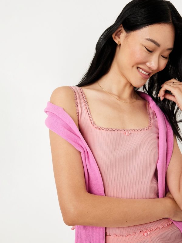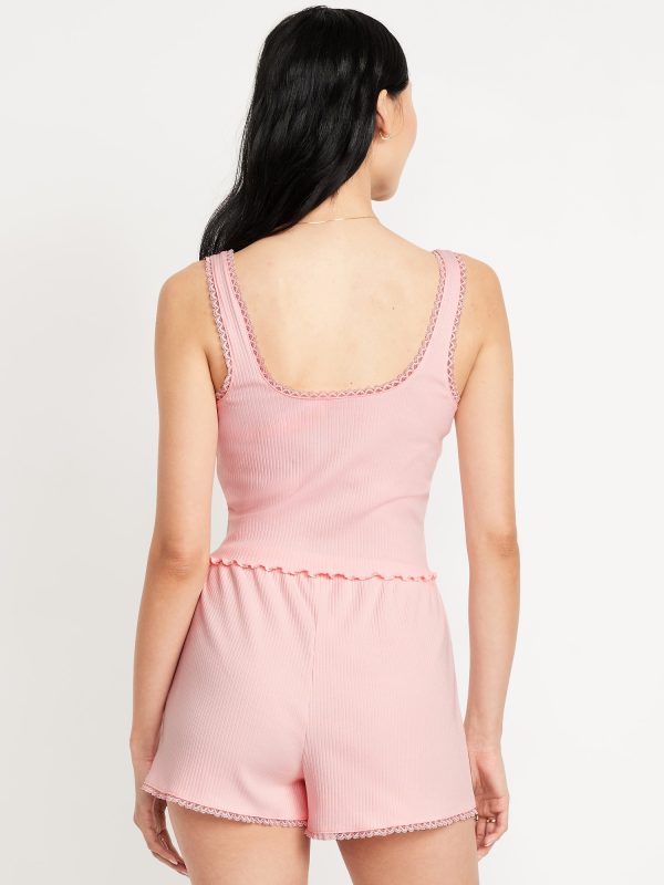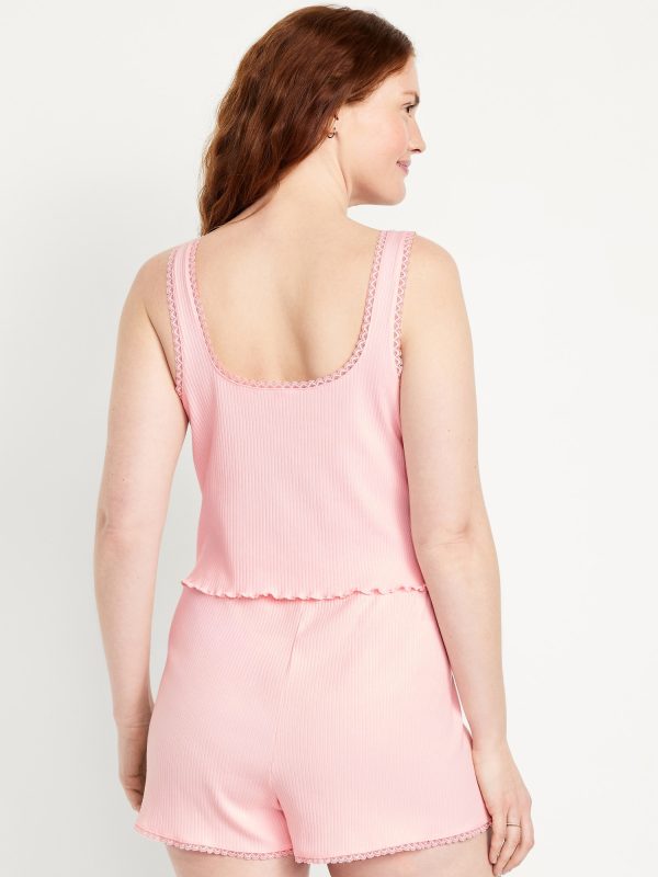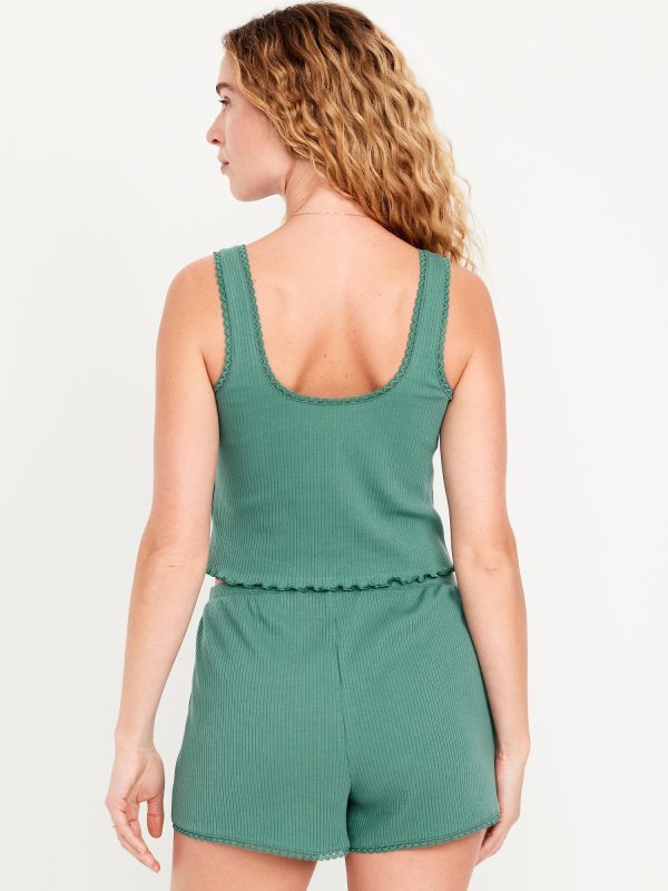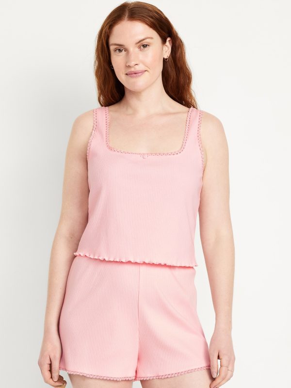 Rib Cropped Pajama Tank Top: ruffle-trim scoop neck, wide straps, lettuce-edge hem, #707474