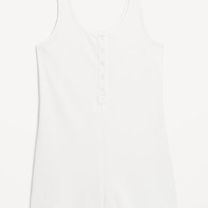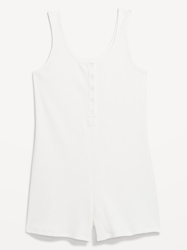 Rib Henley Pajama Romper: scoop neck, wide straps, functional snap placket, #707389