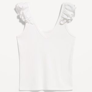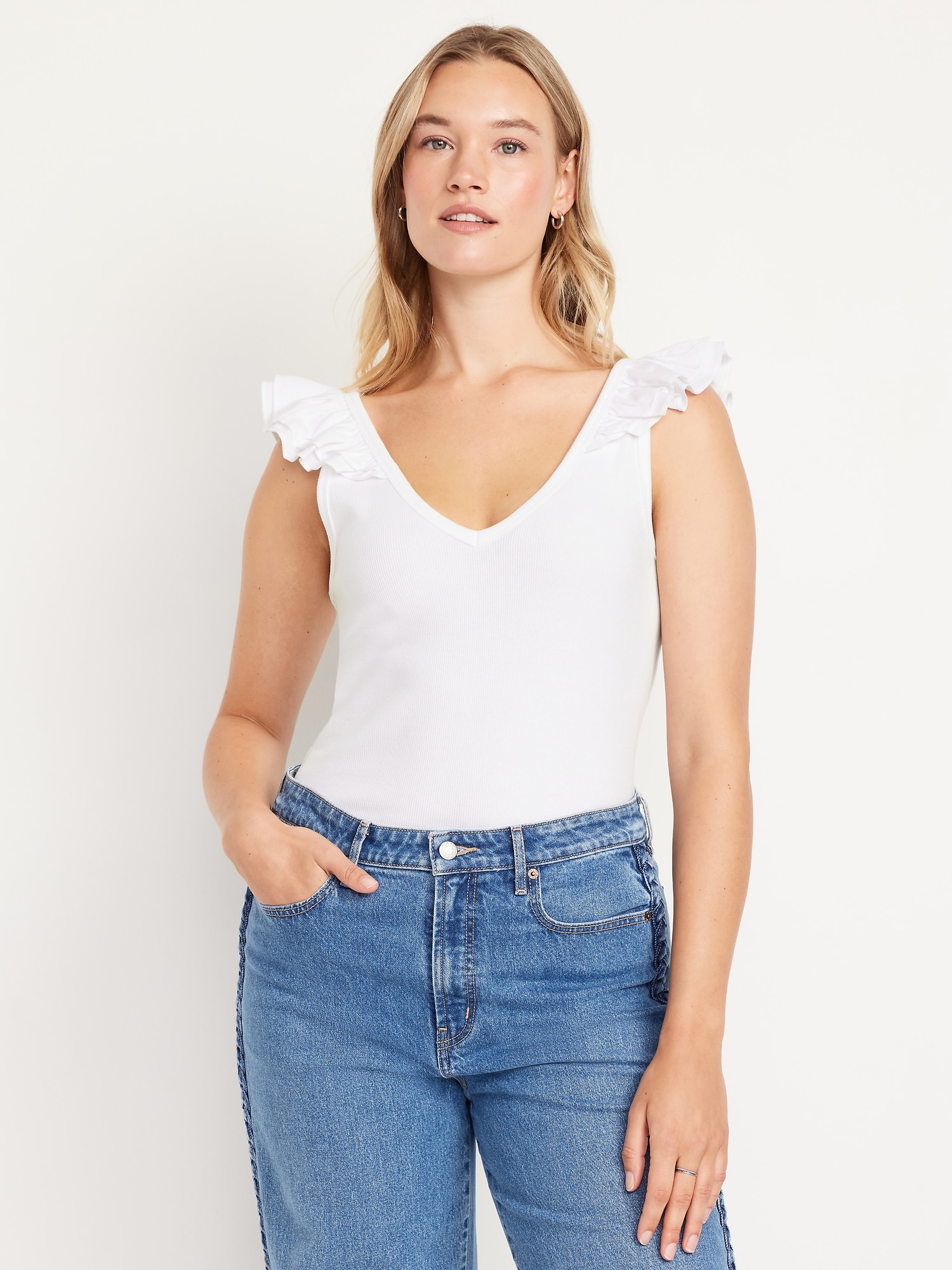Ruffle-Trim Mixed Material Top: v-neck, ruffled sleeve openings, #686637