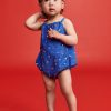 Ruffle-Trim Twill Pocket Shortalls for Baby: wide adjustable straps, ruffle trim along straps and sides, elasticized bubble leg openings, ring-snaps along inseam, patch pockets at front, embroidered flowers at pockets, #689707