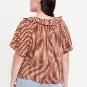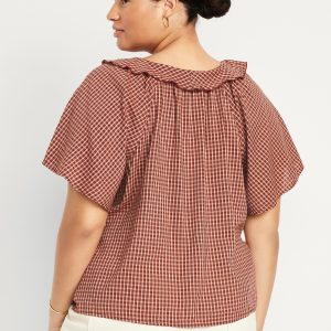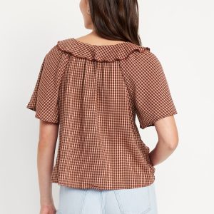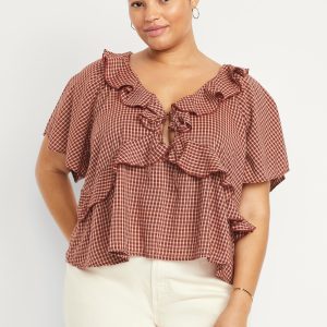 Ruffle V-Neck Top: tie-front v-neck, ruffle overlay at front, short flutter sleeves, #805737