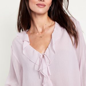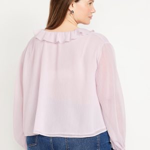 Ruffled Chiffon Cropped Blouse: ruffled v-neck, long drop-shoulder sleeves, elastic tie cuffs, decorative tie front, #704110