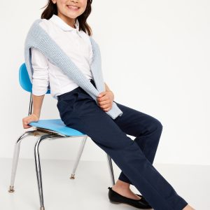 School Uniform Straight Leg Pants for Girls: interior adjustable waistband, sizes 5-8 snap-decorative button closure, sizes 10-20 regular button closure, zip fly, slant pockets in front, decorative welt pockets in back, #767121