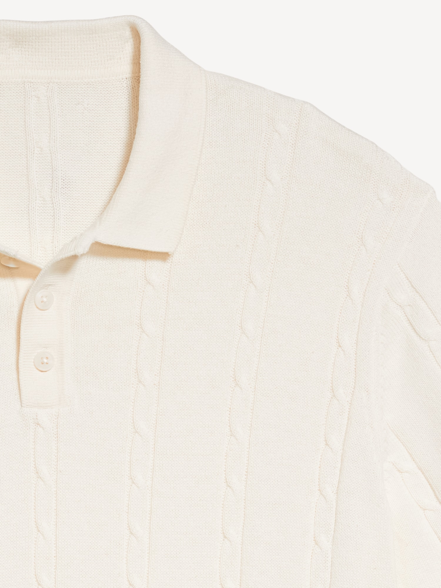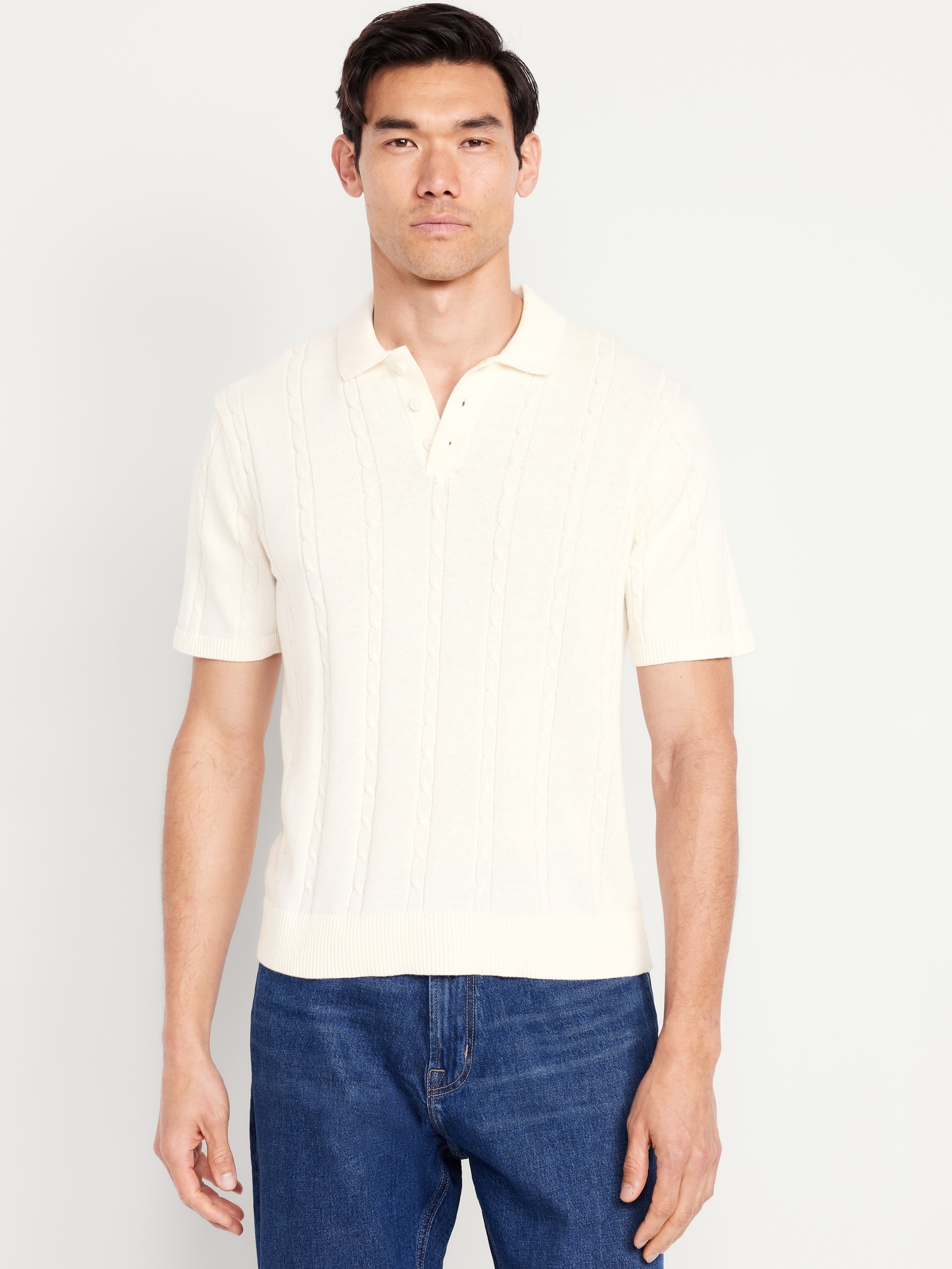 Short-Sleeve Cable-Knit Polo: spread collar, short sleeves, buttoned placket, pullover style, #802042