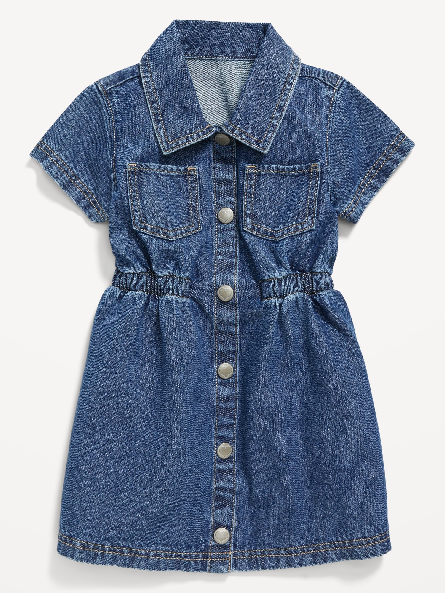 Short-Sleeve Cinched-Waist Jean Dress for Toddler Girls: pointed collar, short sleeves, patch pockets at chest, cinched waist, full length snap-button placket, #767022