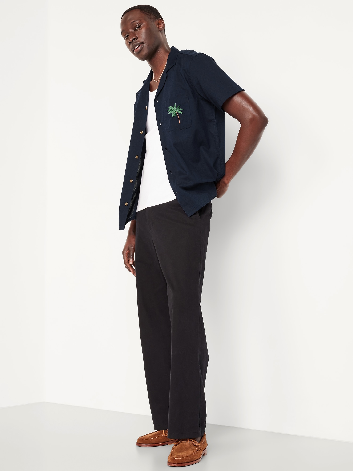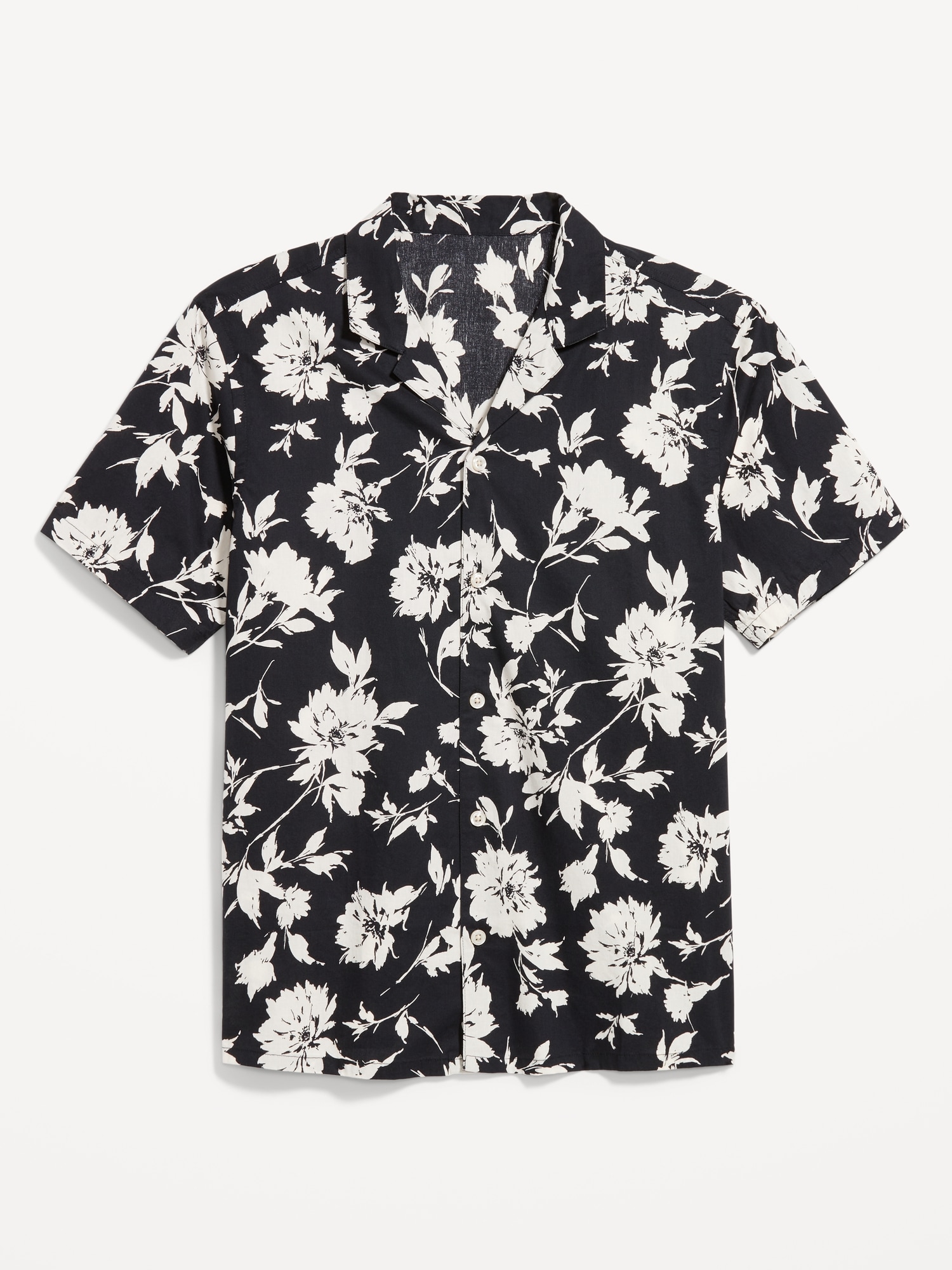 Short-Sleeve Embroidered Camp Shirt: notched collar, short sleeves, full-button front, vertical striped print, #762762