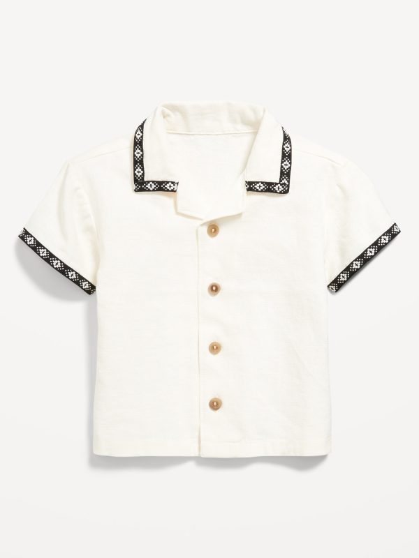 Short-Sleeve Linen-Blend Shirt for Baby: spread collar, short sleeves, full length buttoned placket, side slits at hem, embroidered trim along collar and cuffs (select colors), #762248