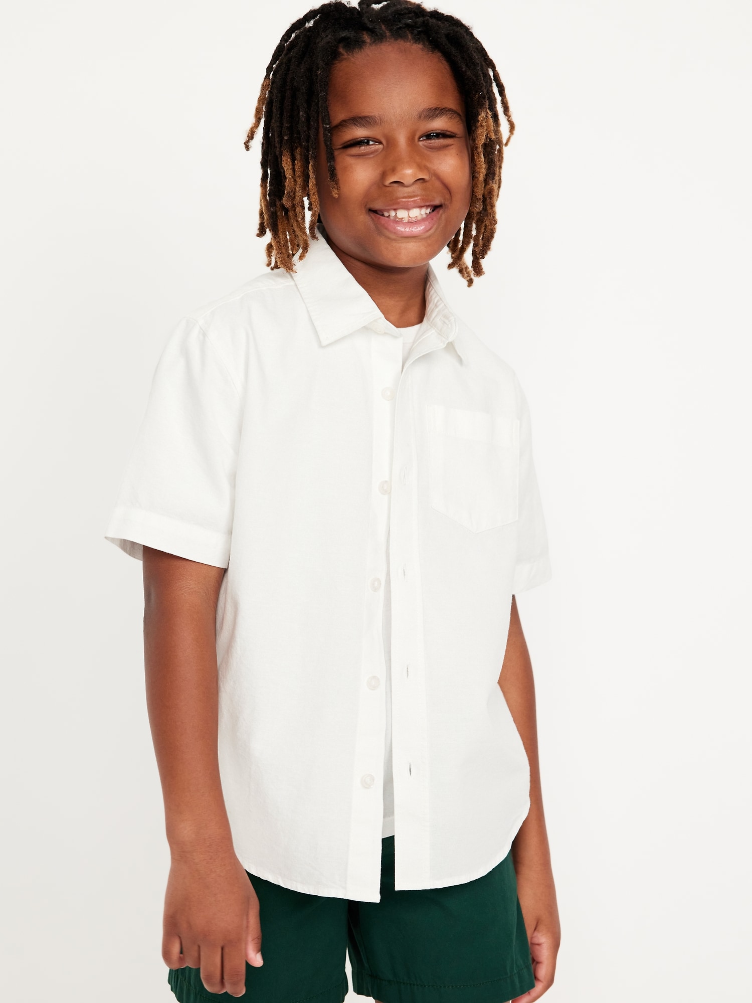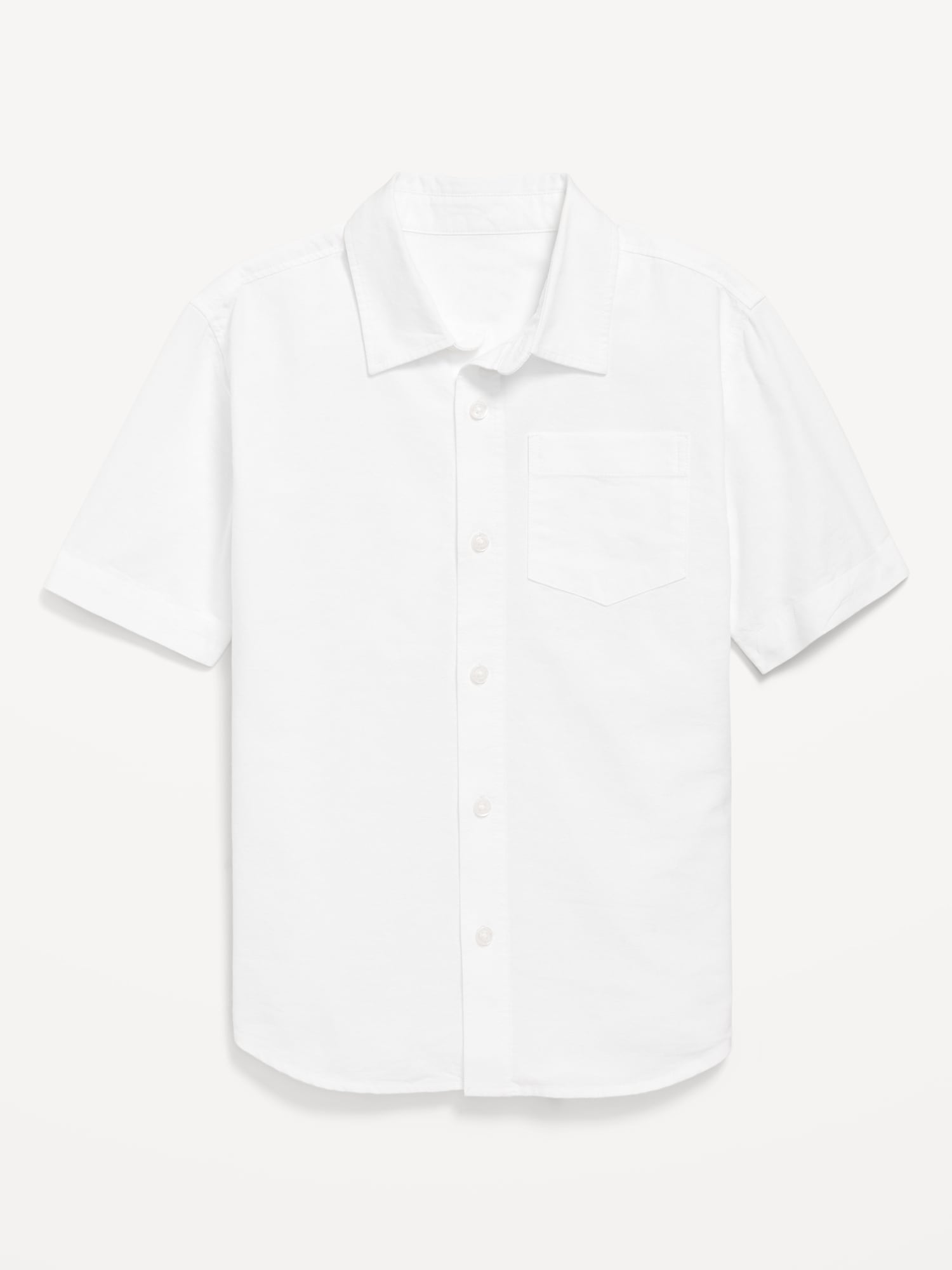 Short-Sleeve Oxford Shirt for Boys: spread collar, short sleeves, patch pocket at chest, full-length buttoned placket, all-over print, #865930