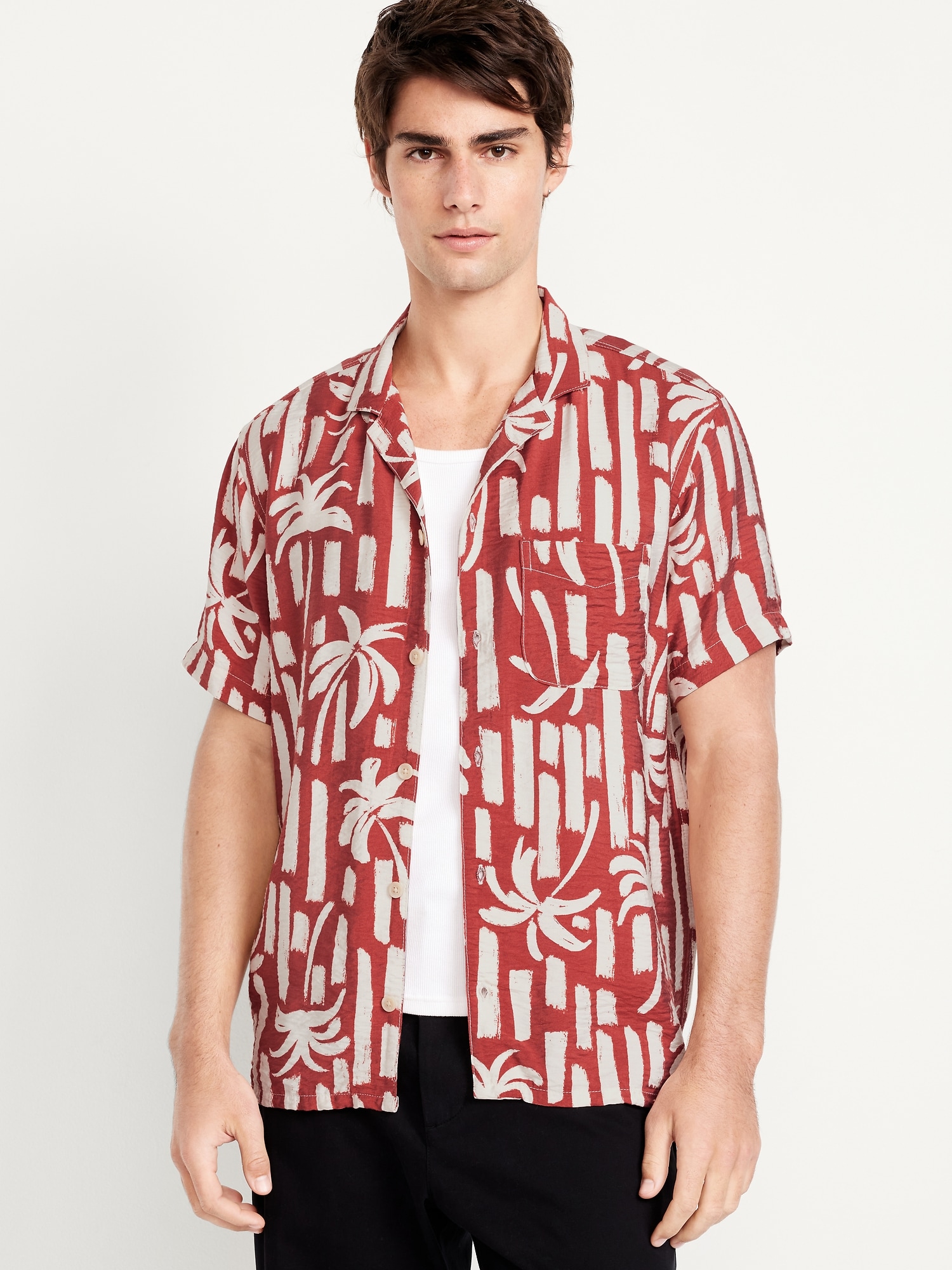 Short-Sleeve Printed Camp Shirt: notched collar, short sleeves, full-button front, vertical striped print, #762762