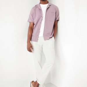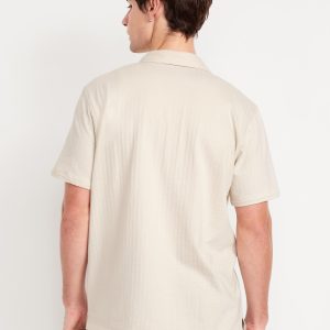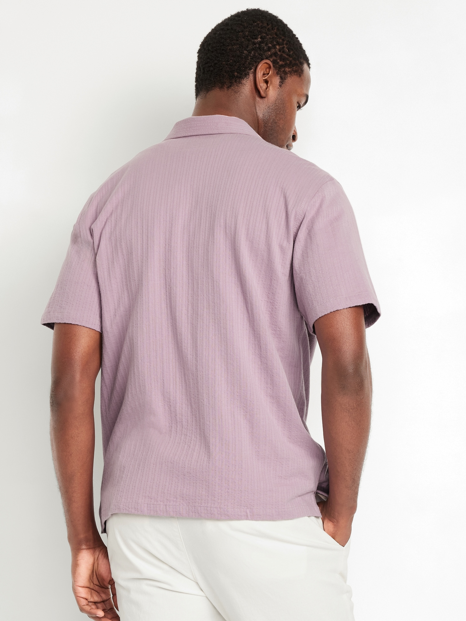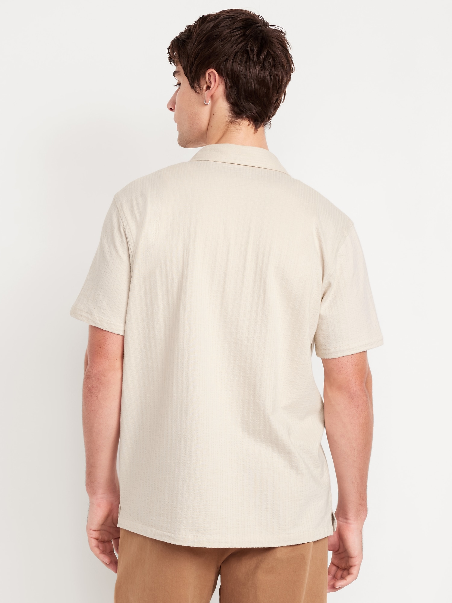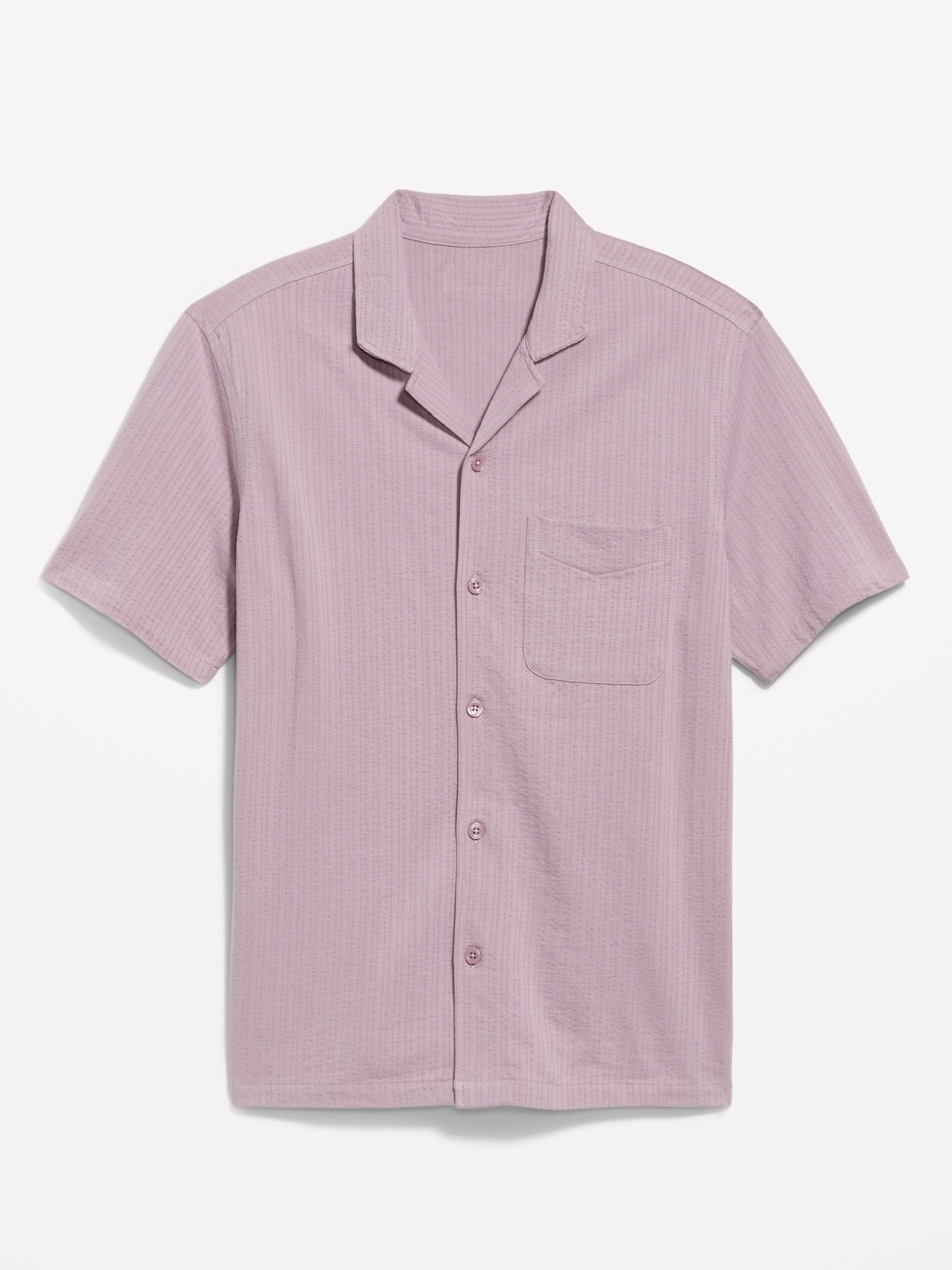 Short-Sleeve Seersucker Camp Shirt: notched collar, short sleeves, patch chest pocket, full-button front, vented sides, #762062