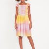 Short-Sleeve Textured Embroidered Top for Girls: smocked neckline, keyhole cutout with button loop closure at nape, embroidered floral pattern along neck, short sleeves, #806079