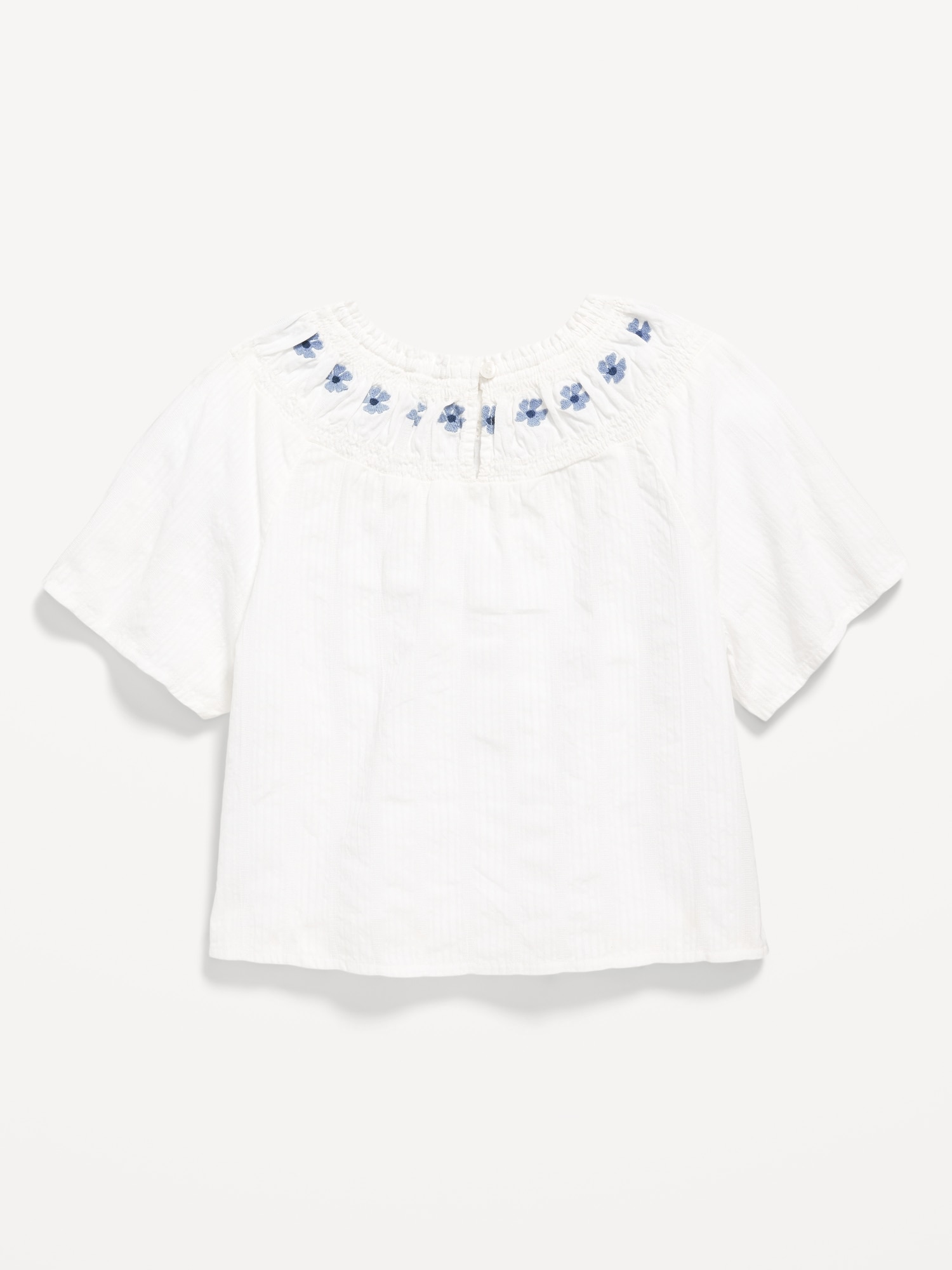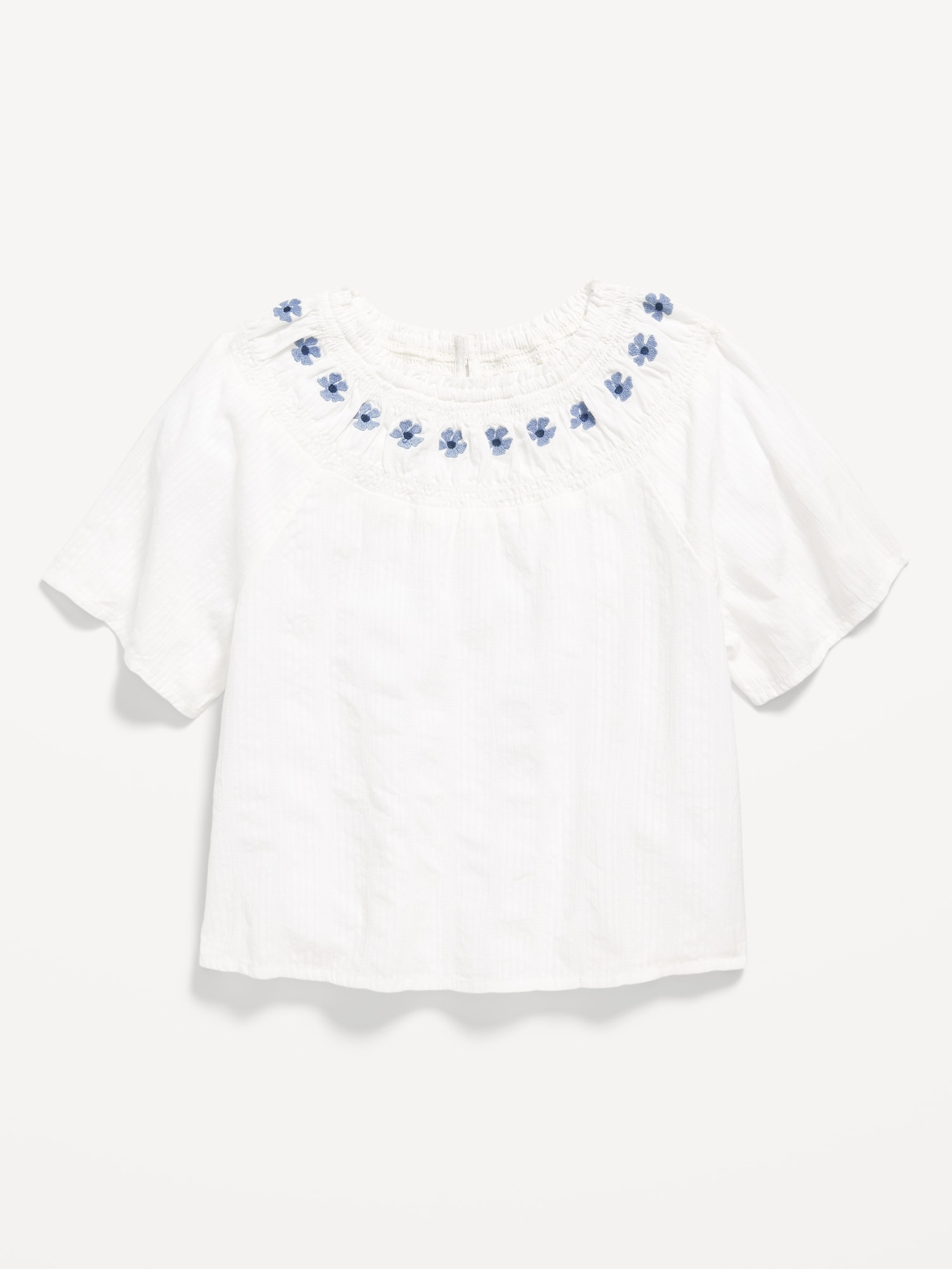 Short-Sleeve Textured Embroidered Top for Girls: smocked neckline, keyhole cutout with button loop closure at nape, embroidered floral pattern along neck, short sleeves, #806079