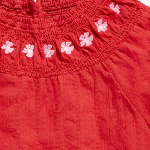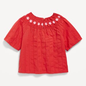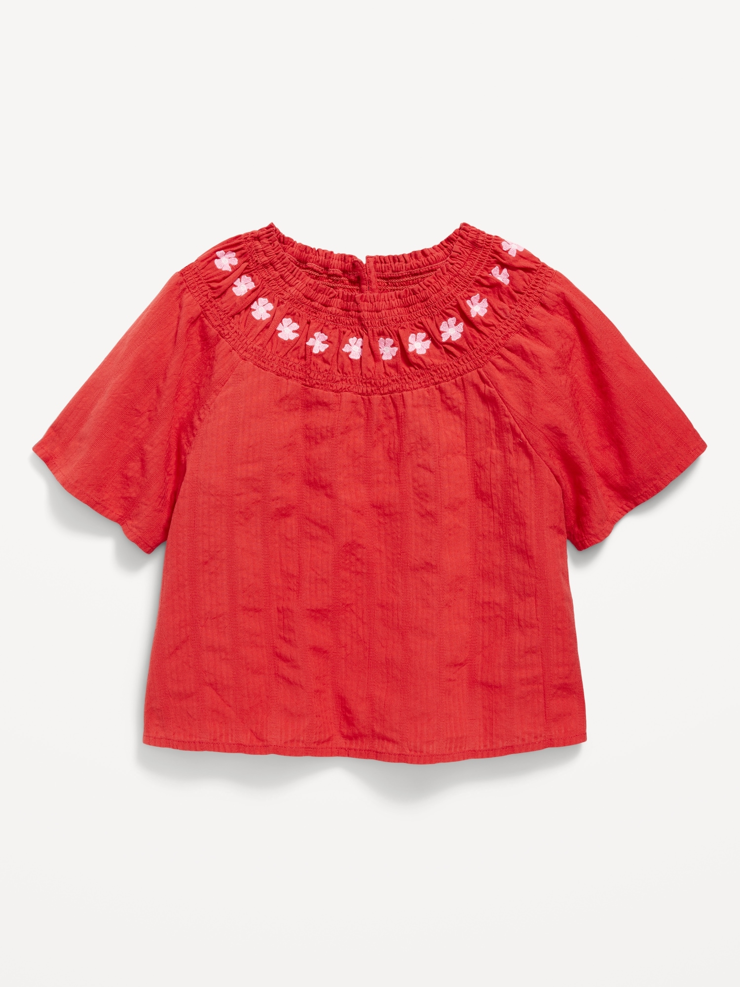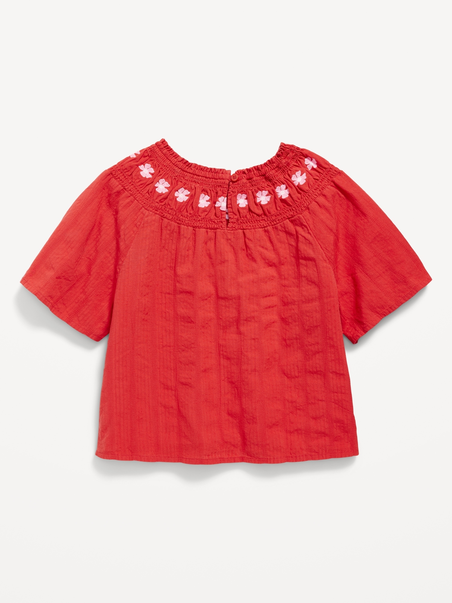 Short-Sleeve Textured Embroidered Top for Girls: smocked neckline, keyhole cutout with button loop closure at nape, embroidered floral pattern along neck, short sleeves, #806079