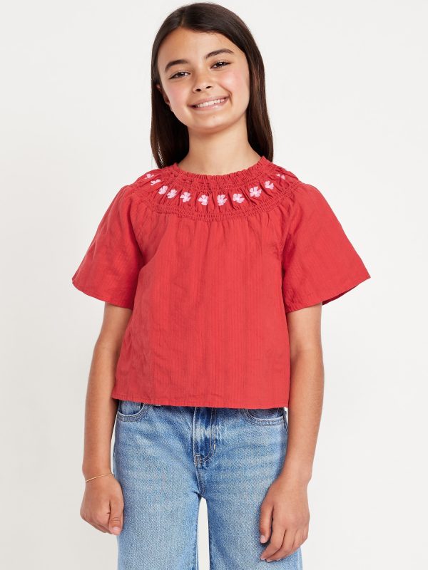 Short-Sleeve Textured Embroidered Top for Girls: smocked neckline, keyhole cutout with button loop closure at nape, embroidered floral pattern along neck, short sleeves, #806079