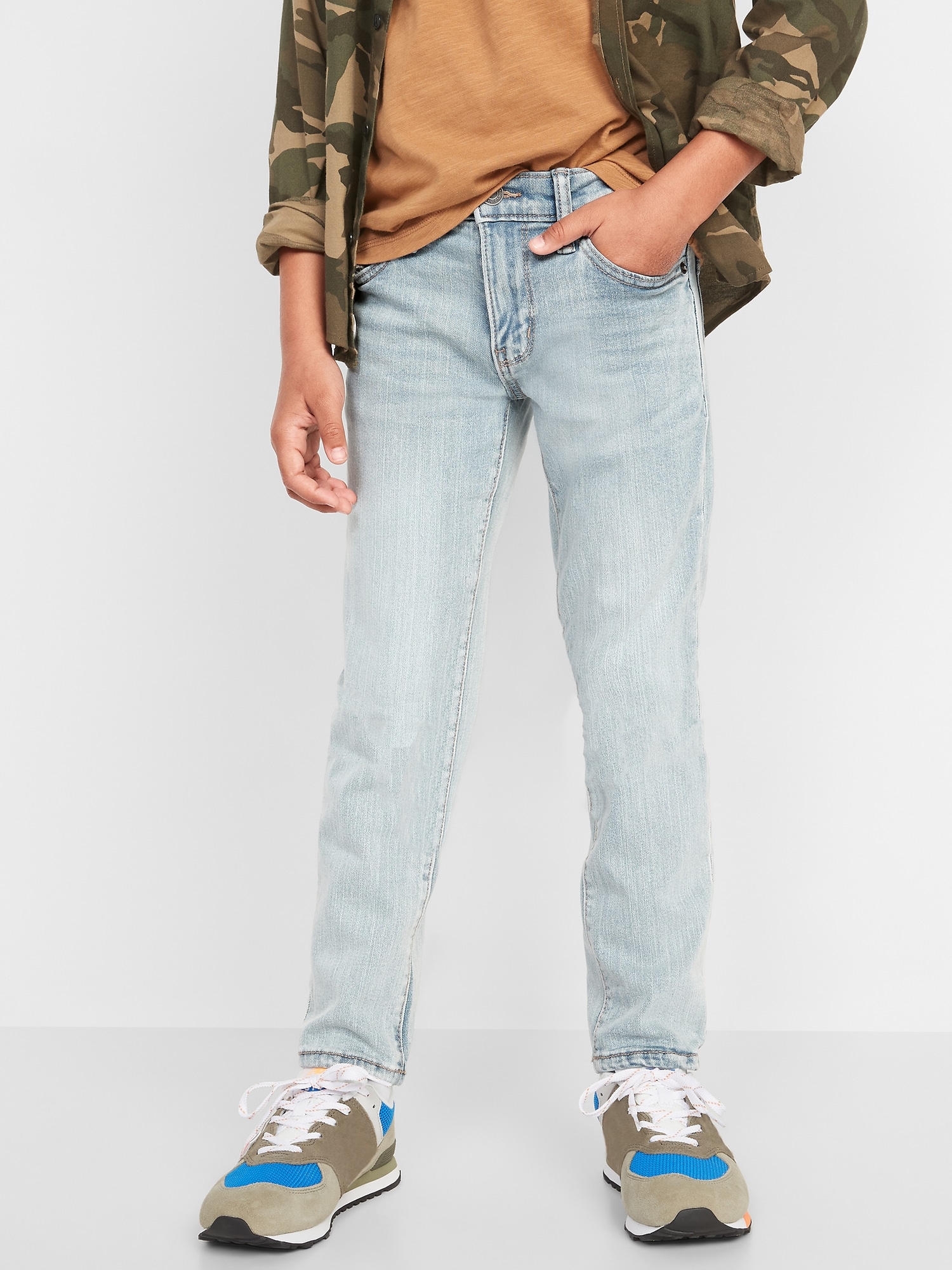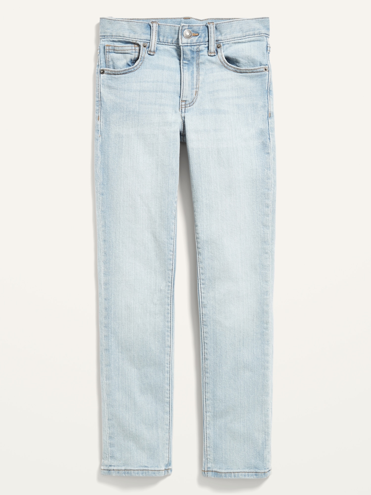 Skinny Built-In Flex Jeans for Boys: Comfy, durable, wear-on-repeat faves., Interior adjustable waistband expands for a perfect fit., Snap-button closure in sizes 5-8; regular button closure in sizes 10-18., Button closure and zip fly., Riveted scoop pockets and coin pocket in front; patch pockets in back., Fading at thigh creates a lived-in look., Engineered with innovative Built-In Flex stretch technology. Equal parts comfort & movement., Built-In Tough fabric has 2x the strength of regular denim!, Durable medium-wash denim, with comfortable stretch and contrast topstitching., We’ve updated the fabric content on select colors & patterns of this style. Select inventory may reflect a slightly different fabric content of 91% cotton, 7% recycled cotton, 2% spandex., #723743