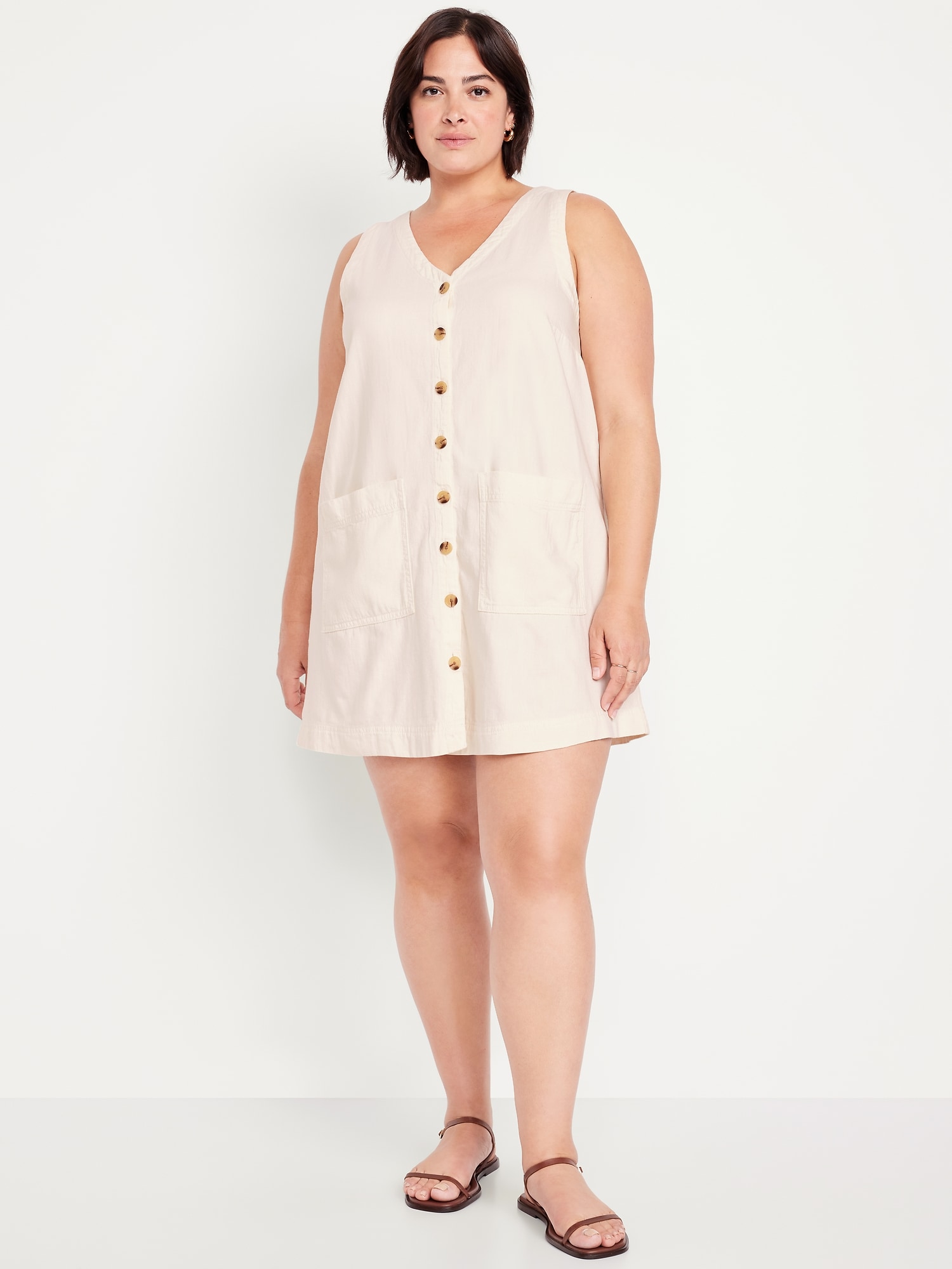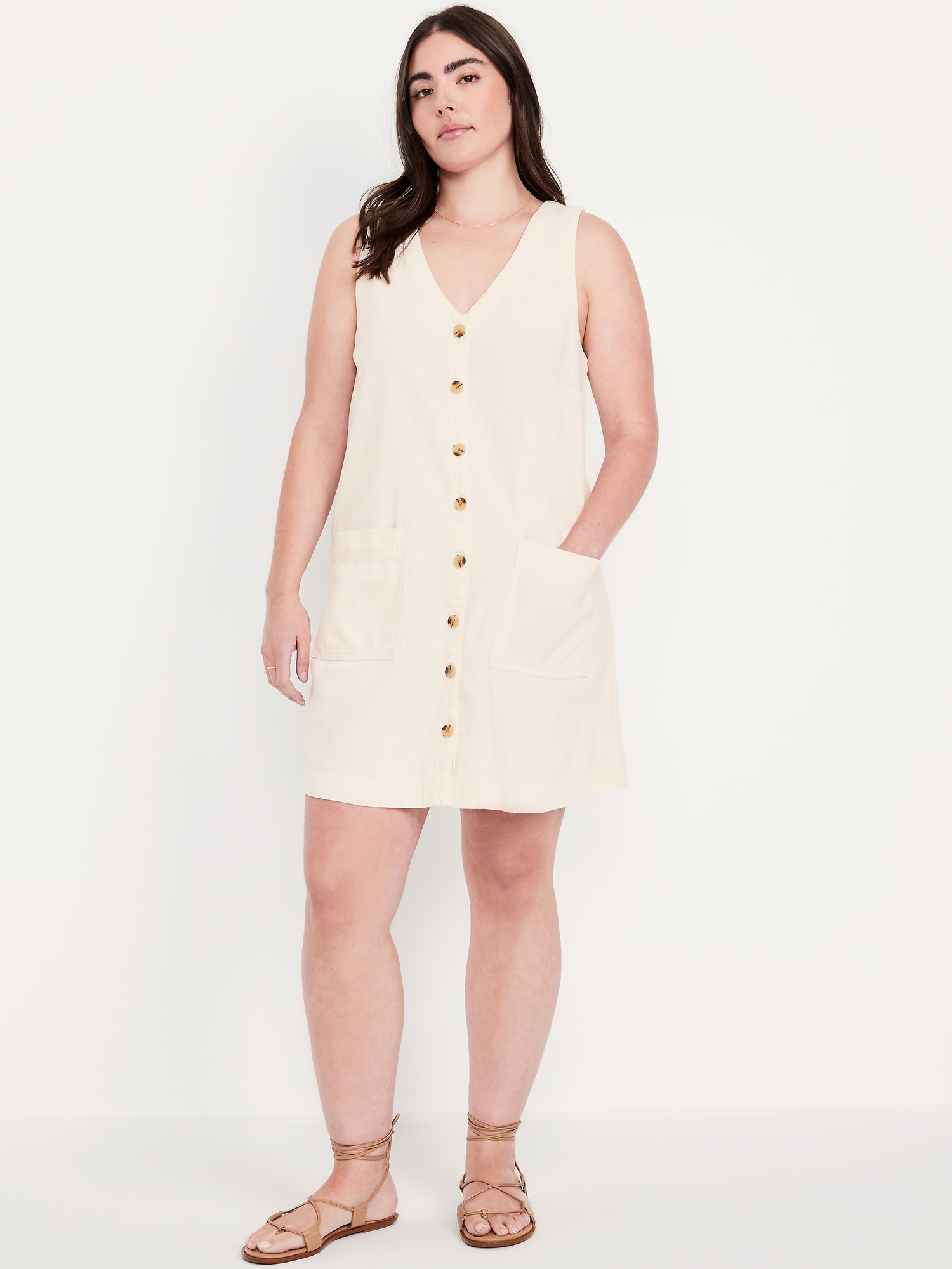 Sleeveless Button-Front Mini Dress: v-neck, wide straps, button front, patch pockets, #766910