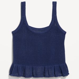Sleeveless Open-Stitch Peplum Sweater: scoop neck, wide straps, floral appliqué accents, ruffled peplum hem, #761610
