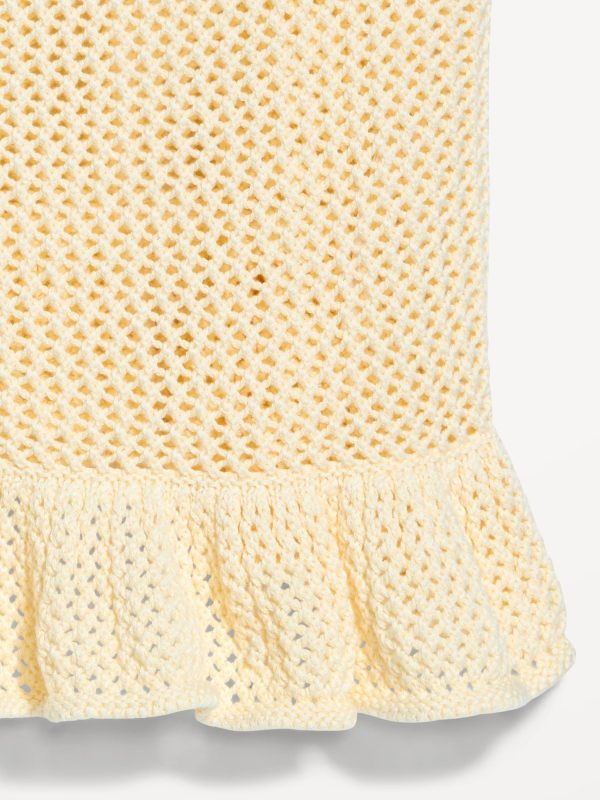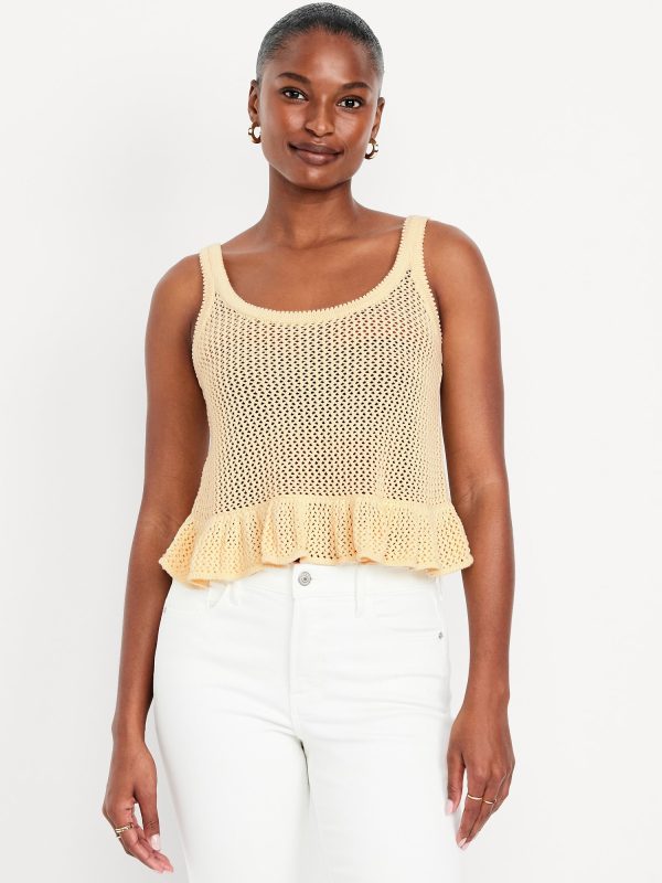 Sleeveless Open-Stitch Peplum Sweater: scoop neck, wide straps, floral appliqué accents, ruffled peplum hem, #761610
