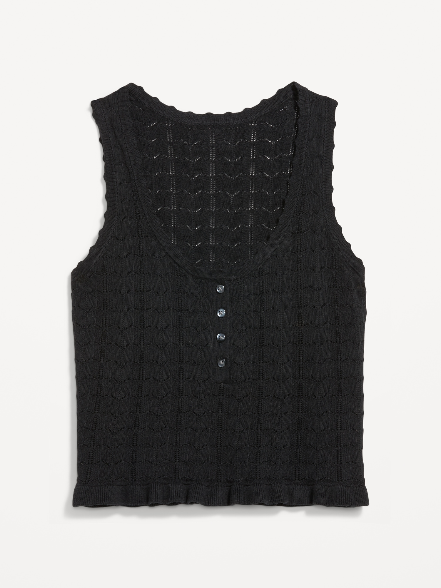Sleeveless Pointelle Cropped Henley Top: scoop neck, wide straps, button-henley placket, ruffled hem, #785032