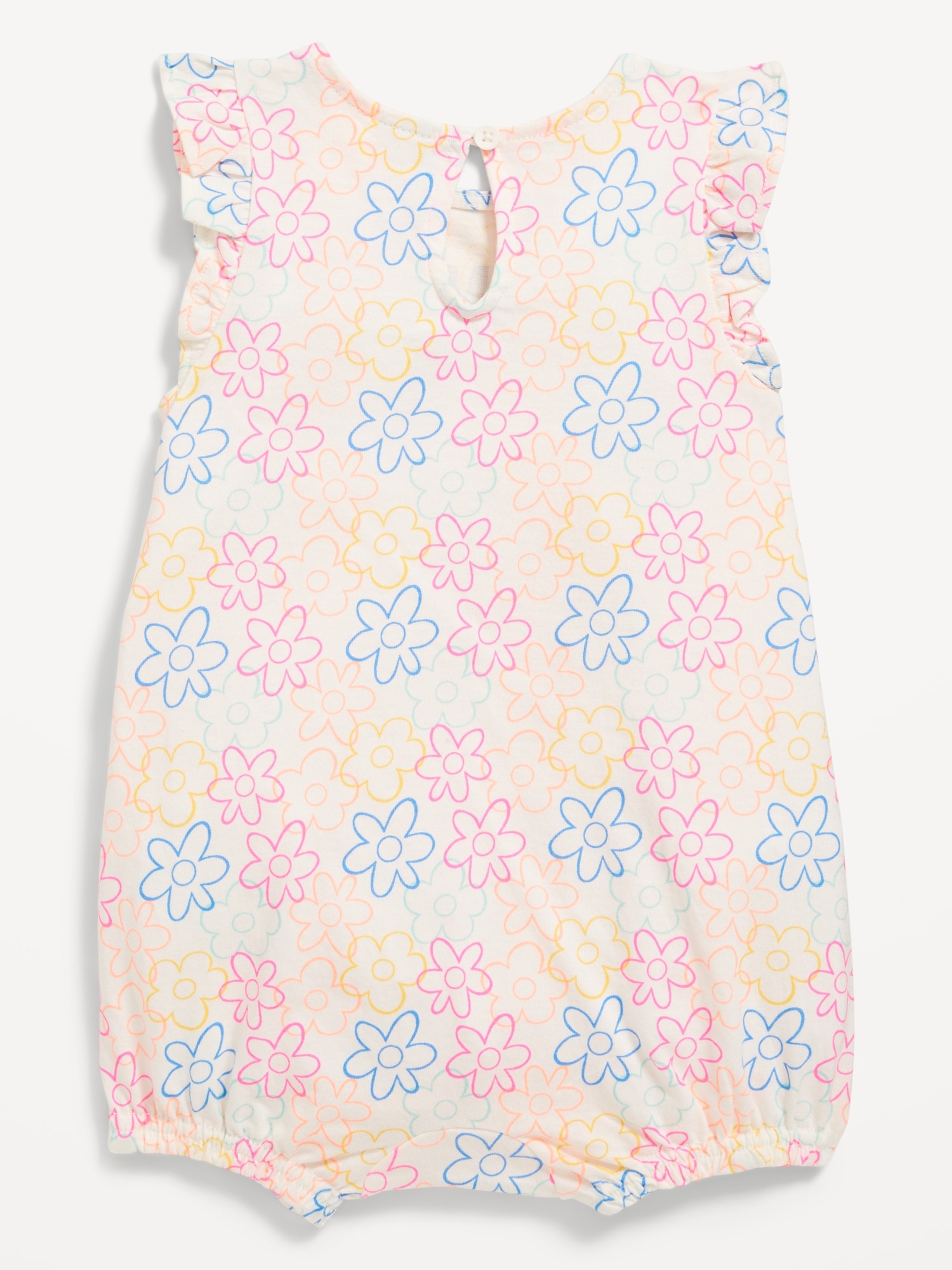 Sleeveless Printed Logo-Graphic One-Piece Romper for Baby: rounded neckline, keyhole cutout at nape, ruffle trim along arm openings, logo graphic, hidden snaps along inseam, all-over print, available exclusively online and at old navy outlet stores., #694153