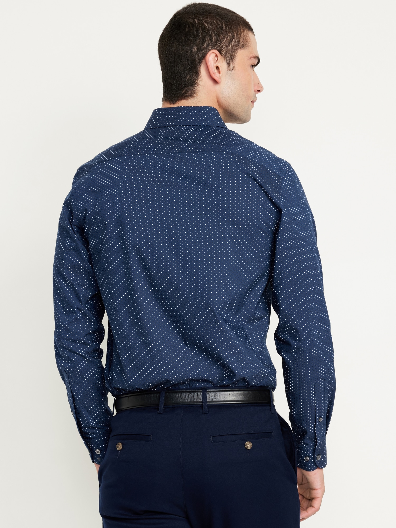 Slim Fit Pro Signature Performance Dress Shirt: 2″ pointed collar, built-in collar stays, long sleeves, buttoned cuffs, full-button front, breathable, quick drying, go-dry wicks moisture, #418101