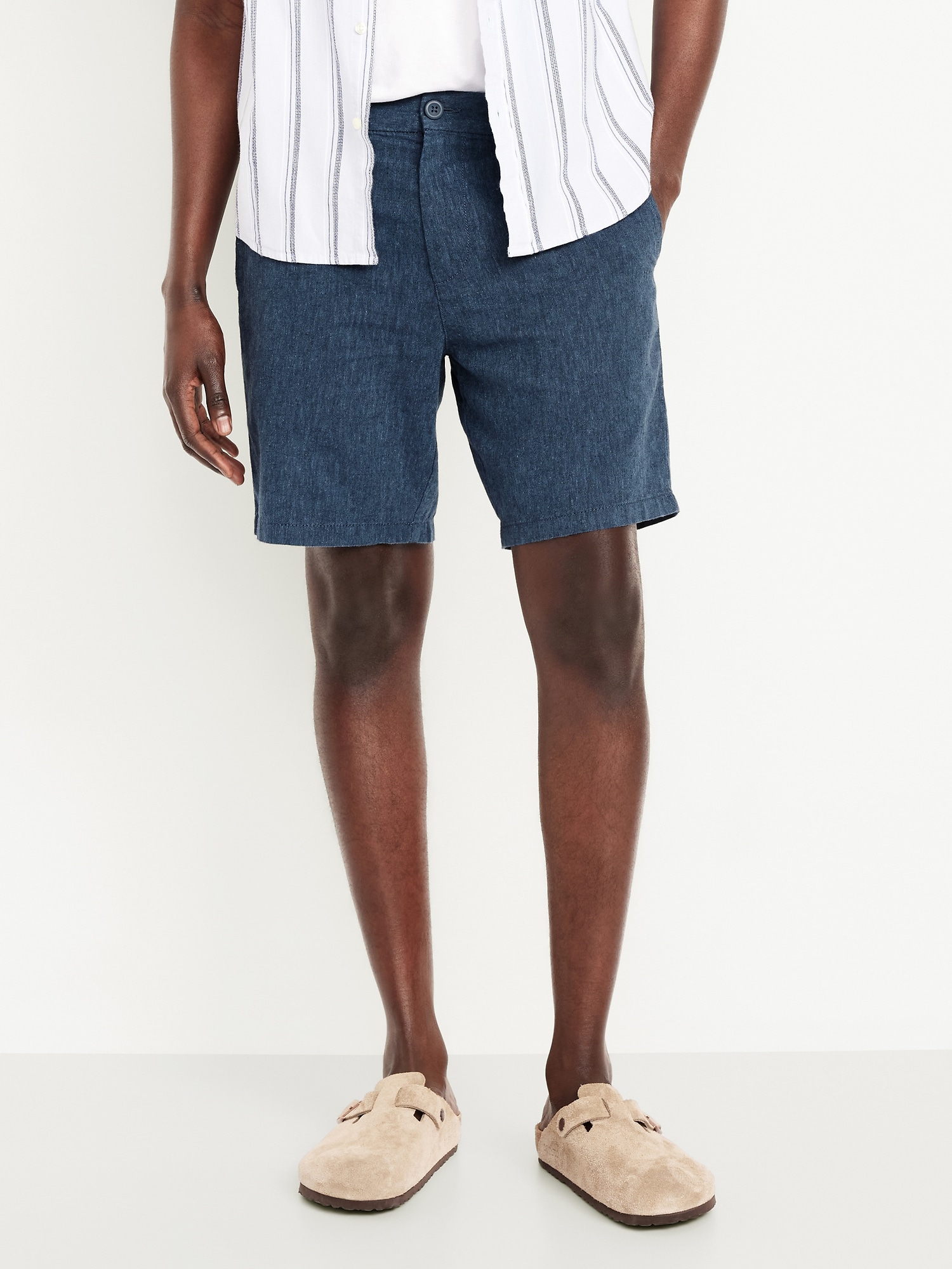 Slim Rotation Linen-Blend Chino Shorts — 8-inch inseam: button front, belt loops, zip fly, on-seam pockets, back welt pockets with button closure at left, #845880
