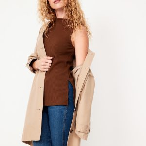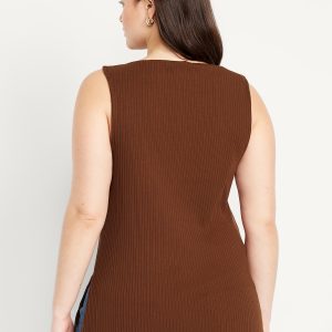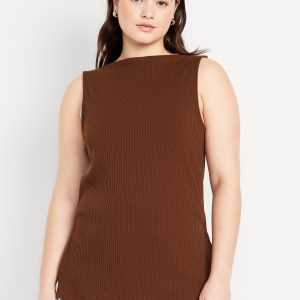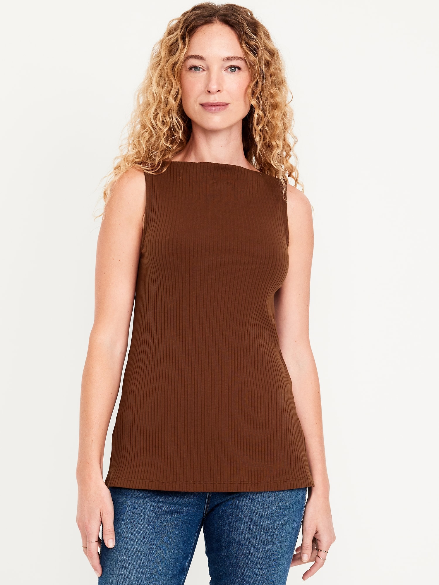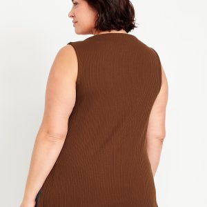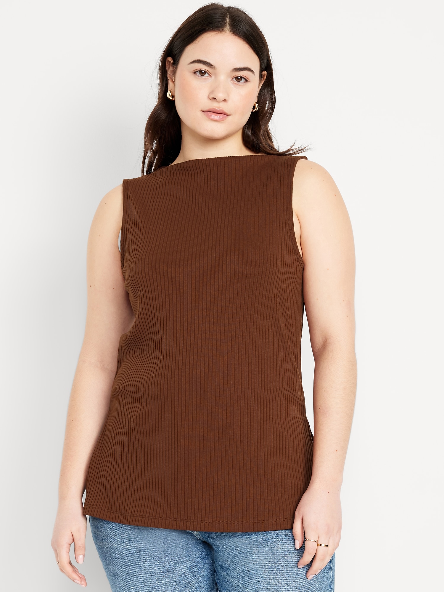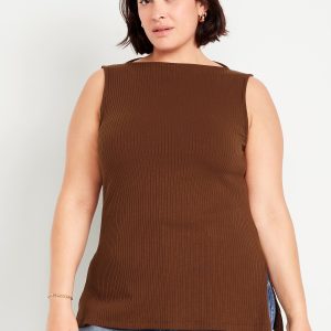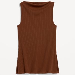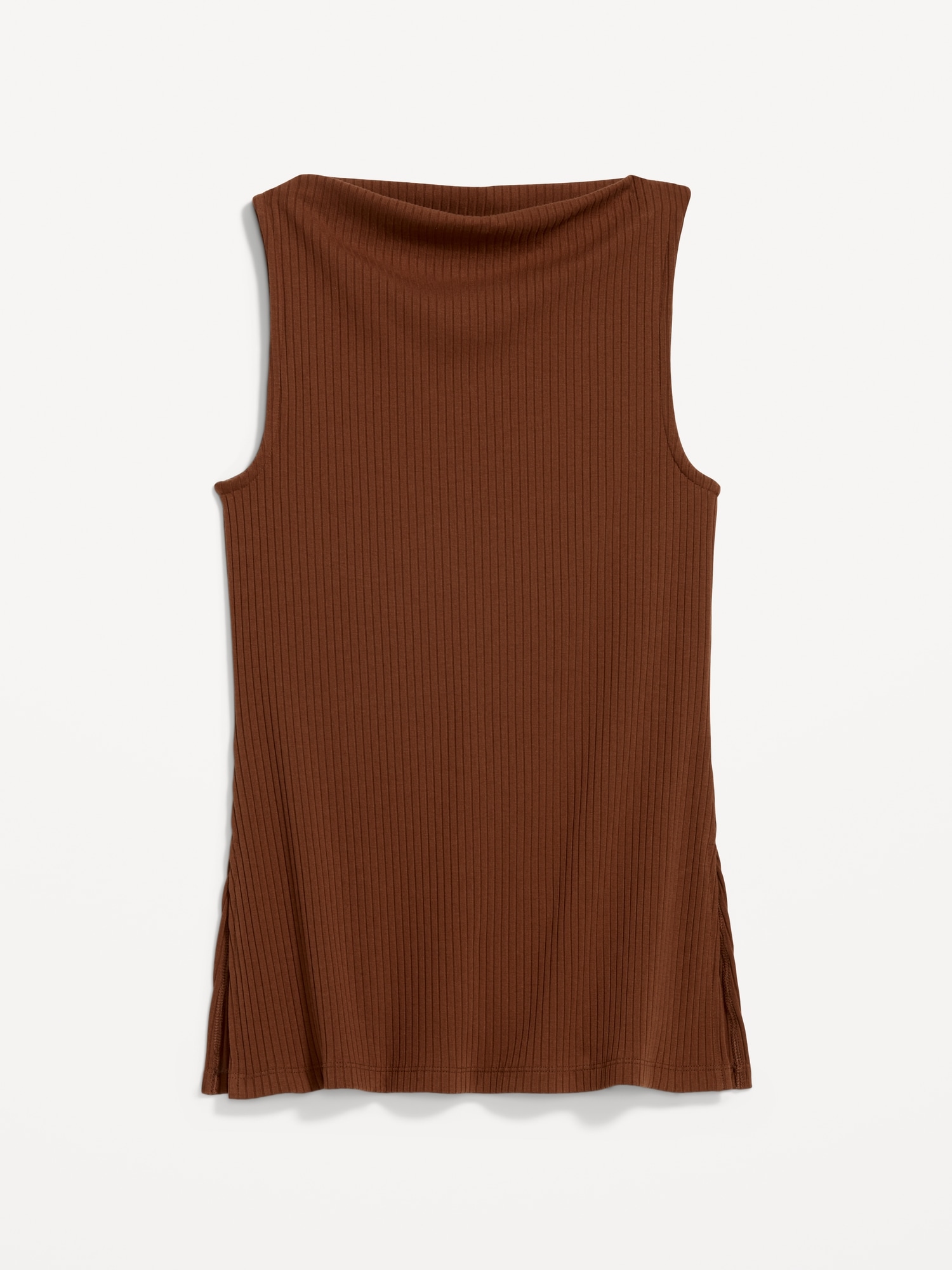 Slit-Neck Ribbed Top: high neck, sleeveless, side slits, #738891