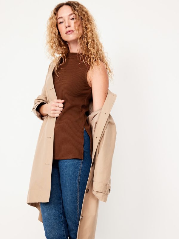 Slit-Neck Ribbed Top: high neck, sleeveless, side slits, #738891