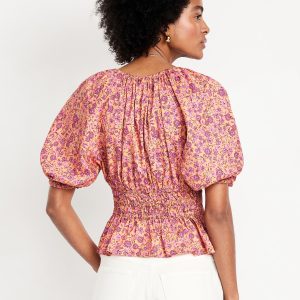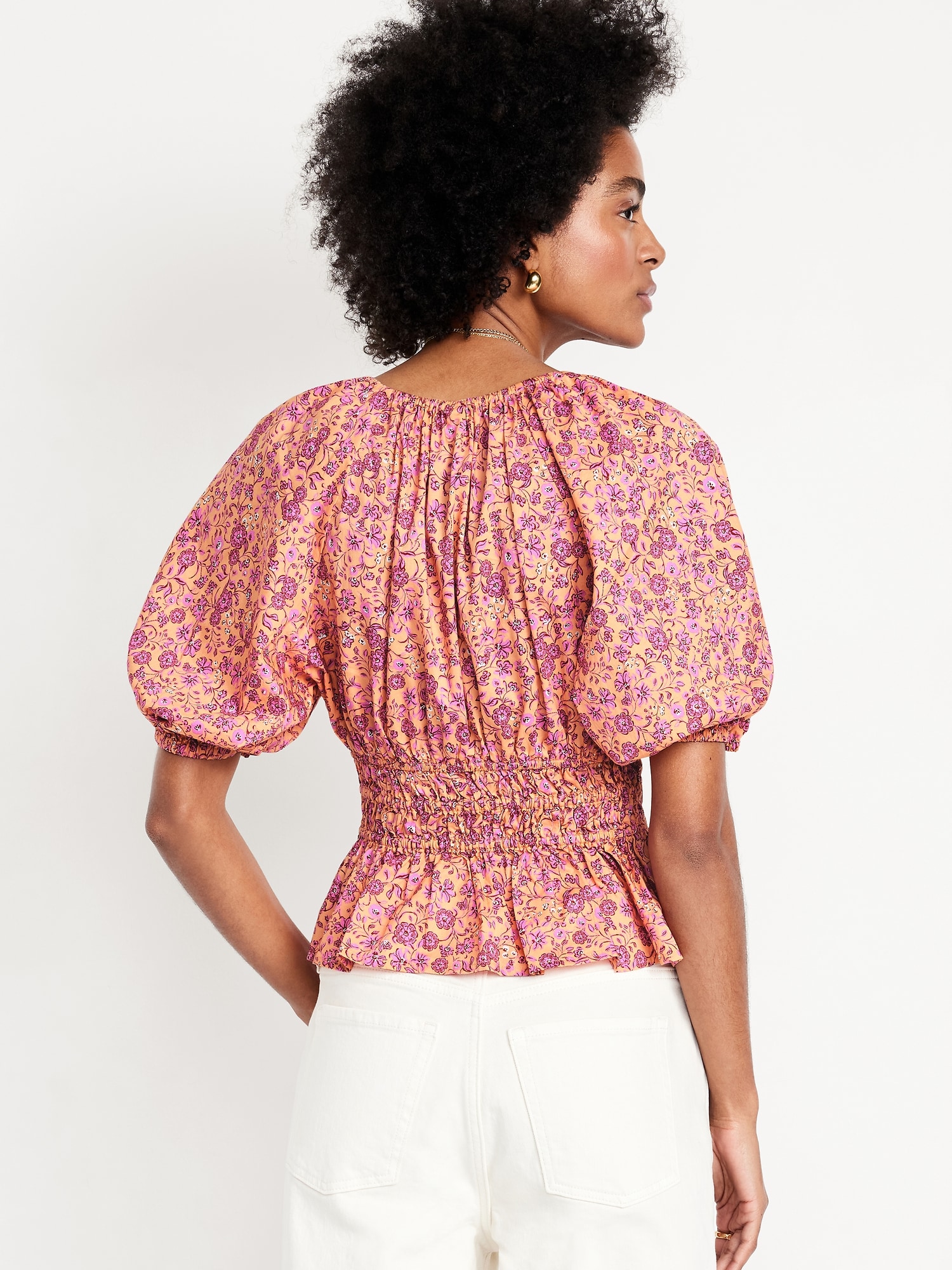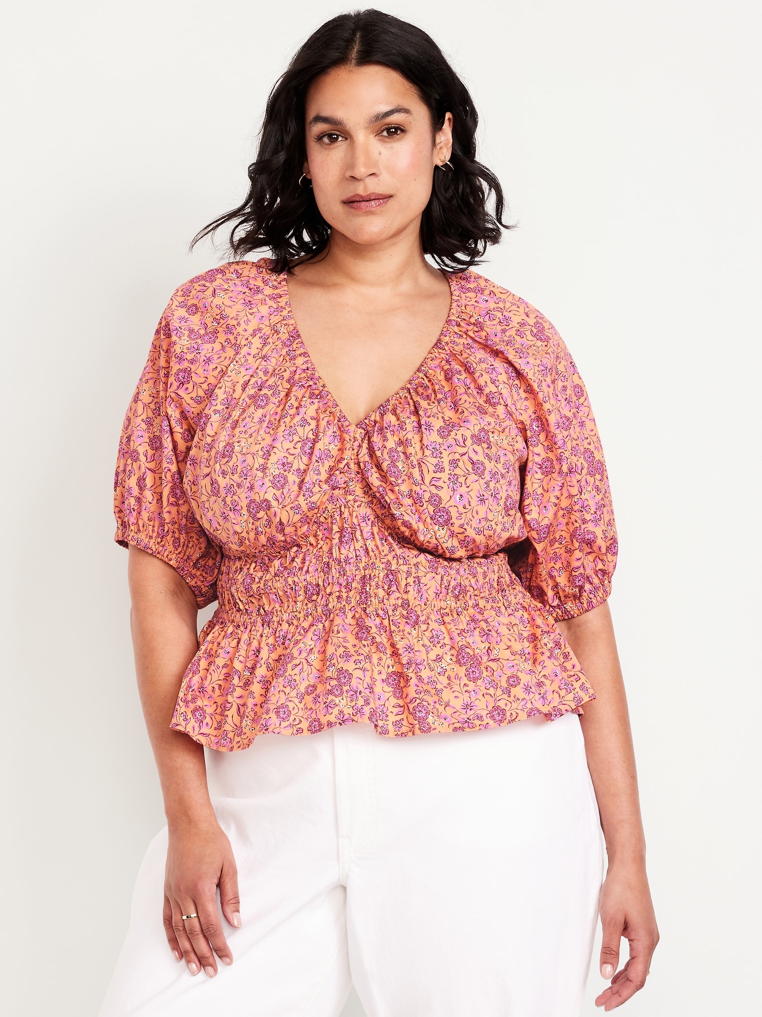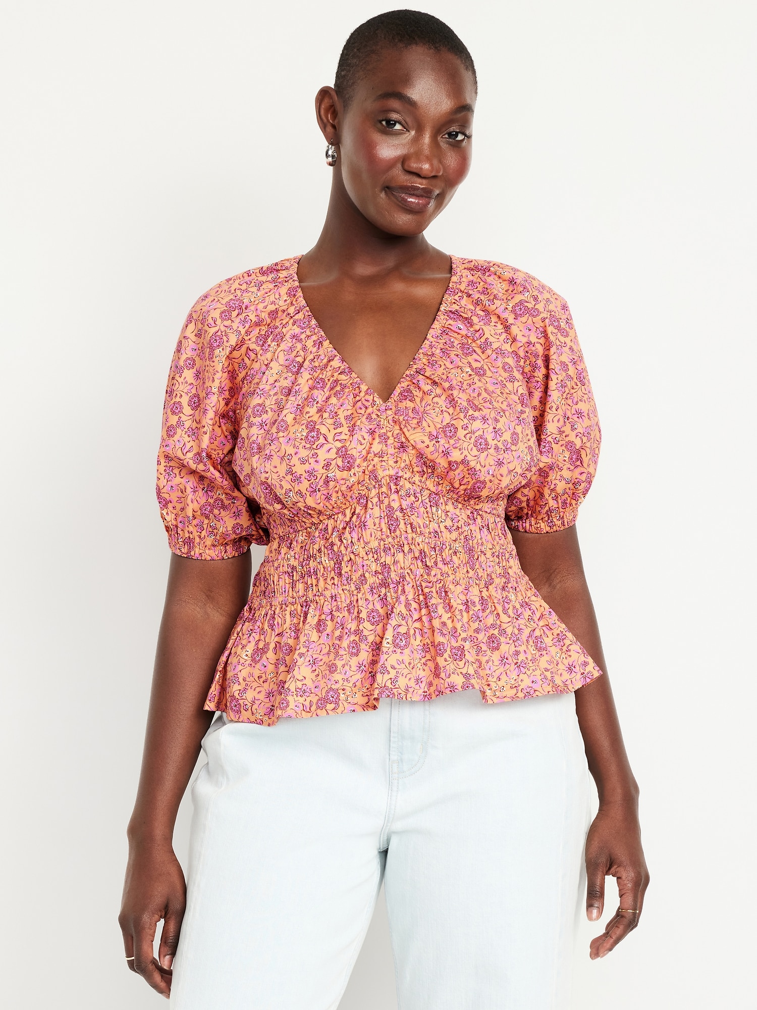 Smocked V-Neck Peplum Top: deep v-neck, elbow sleeves, elastic cuffs, smocked waist, peplum hem, gingham print, #704199