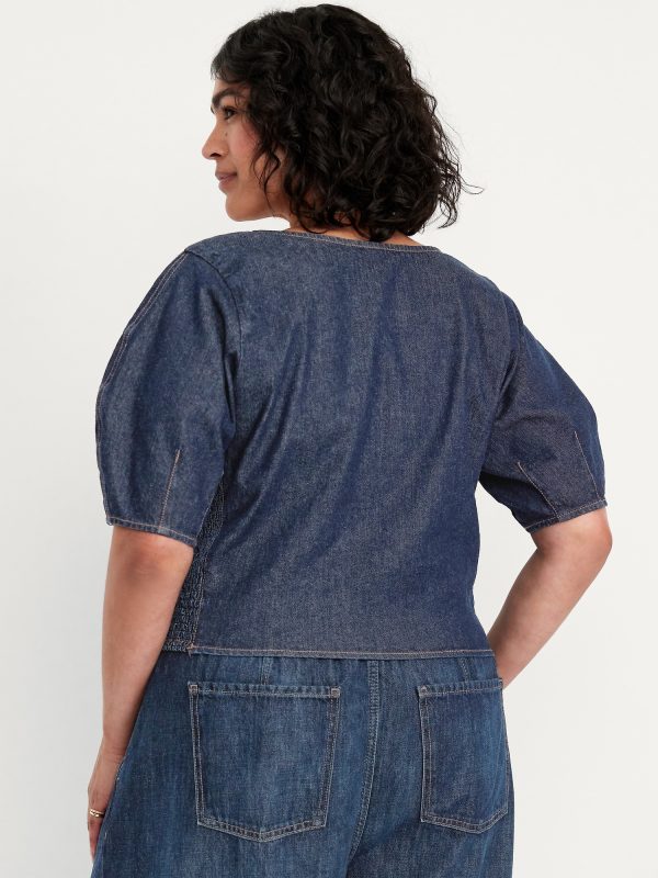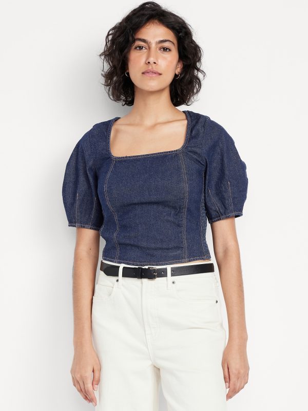 Square-Neck Denim Crop Top: square neck, short puff sleeves, smocked side panels, seamed front, #805746
