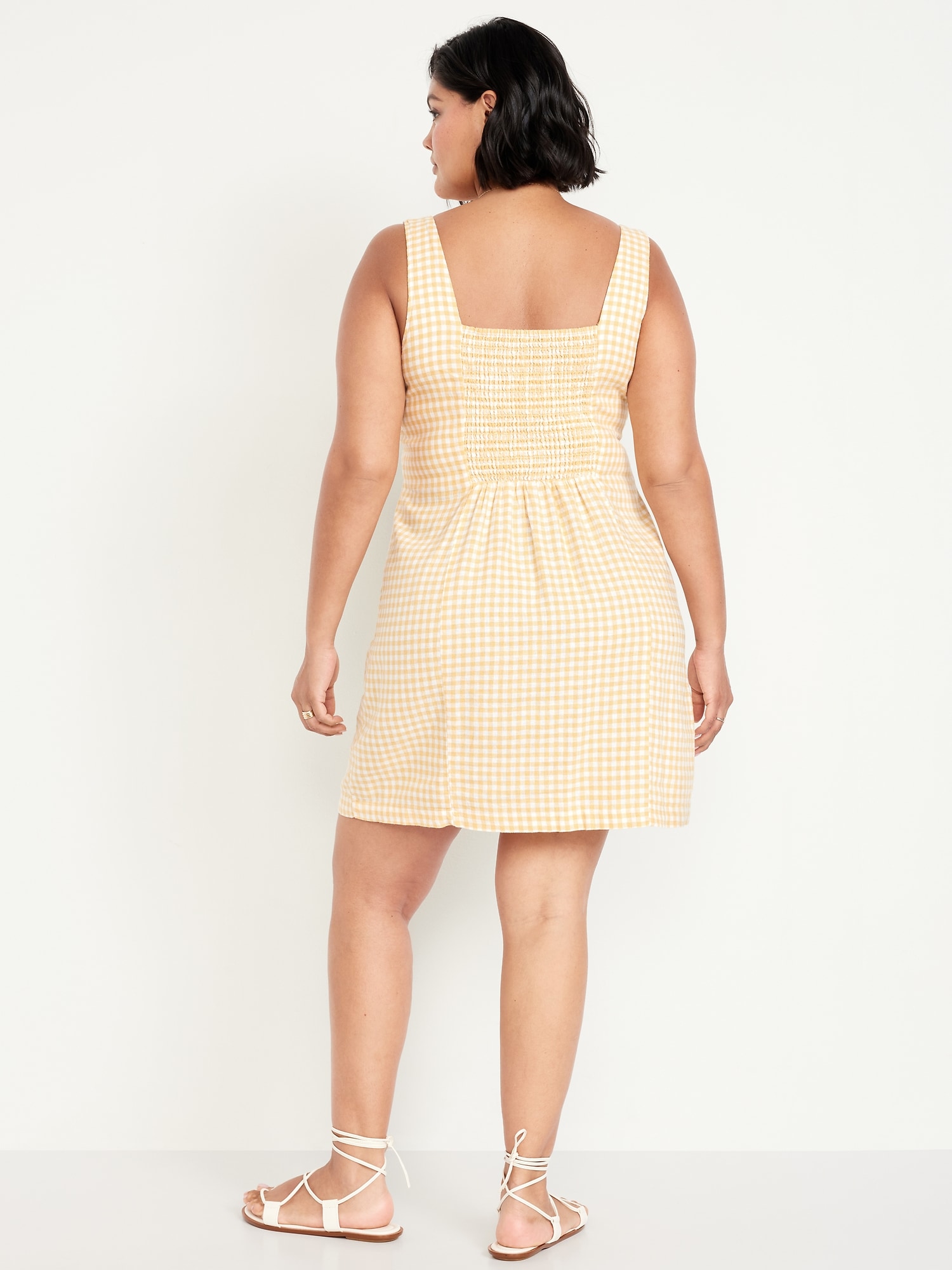 Square-Neck Linen-Blend Mini Dress: square neck, wide straps, smocked back, princess seams, mini length, gingham print, #708450