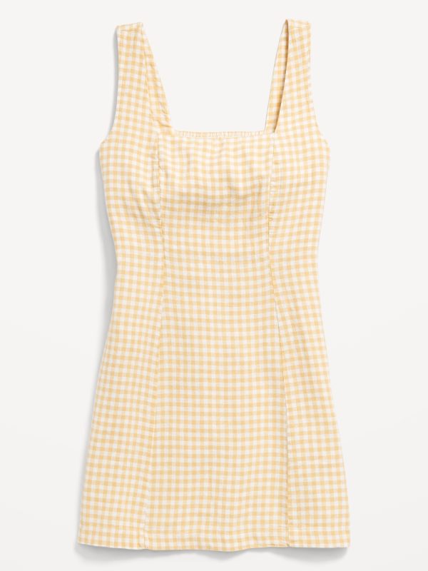 Square-Neck Linen-Blend Mini Dress: square neck, wide straps, smocked back, princess seams, mini length, gingham print, #708450