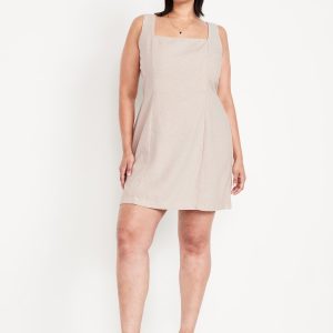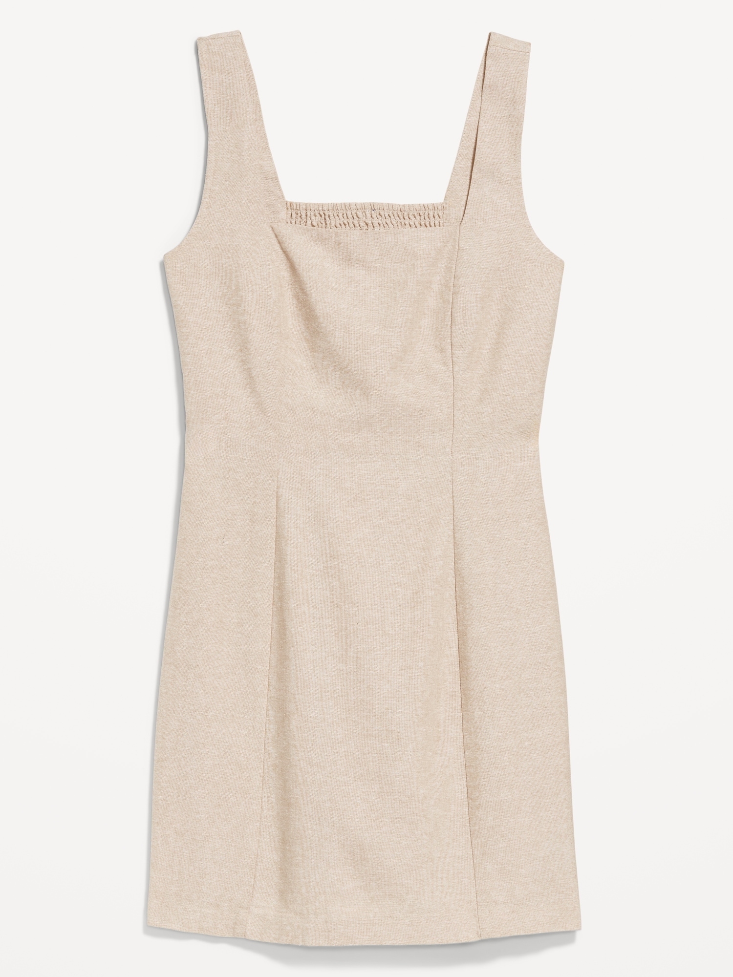 Square-Neck Linen-Blend Mini Dress: square neck, wide straps, smocked back, princess seams, mini length, gingham print, #708450