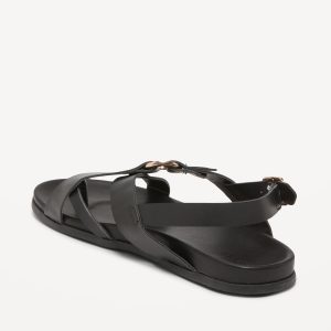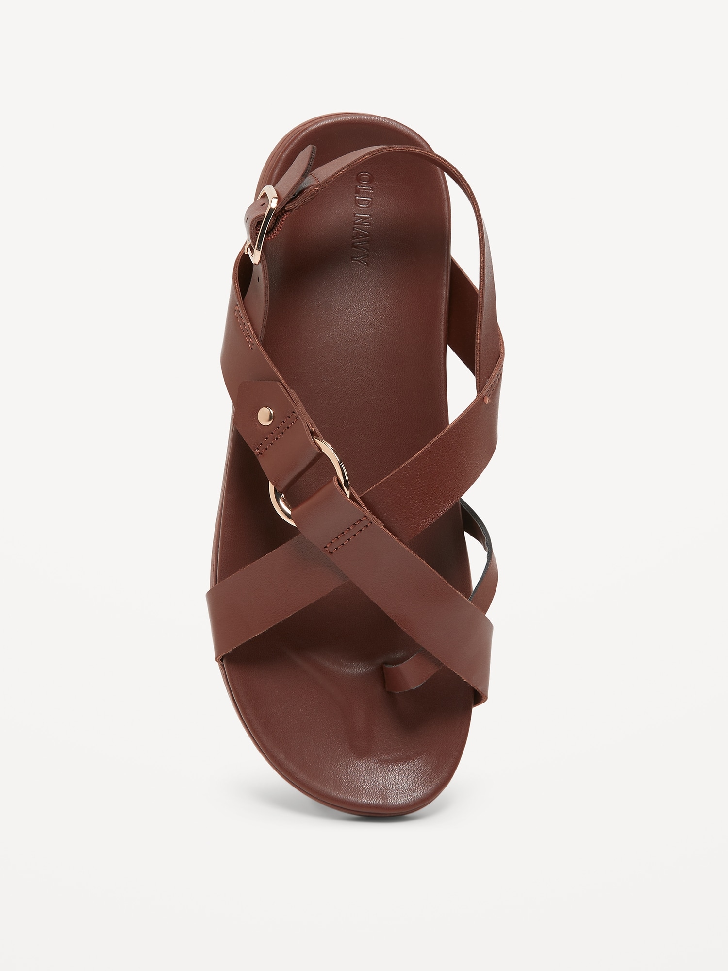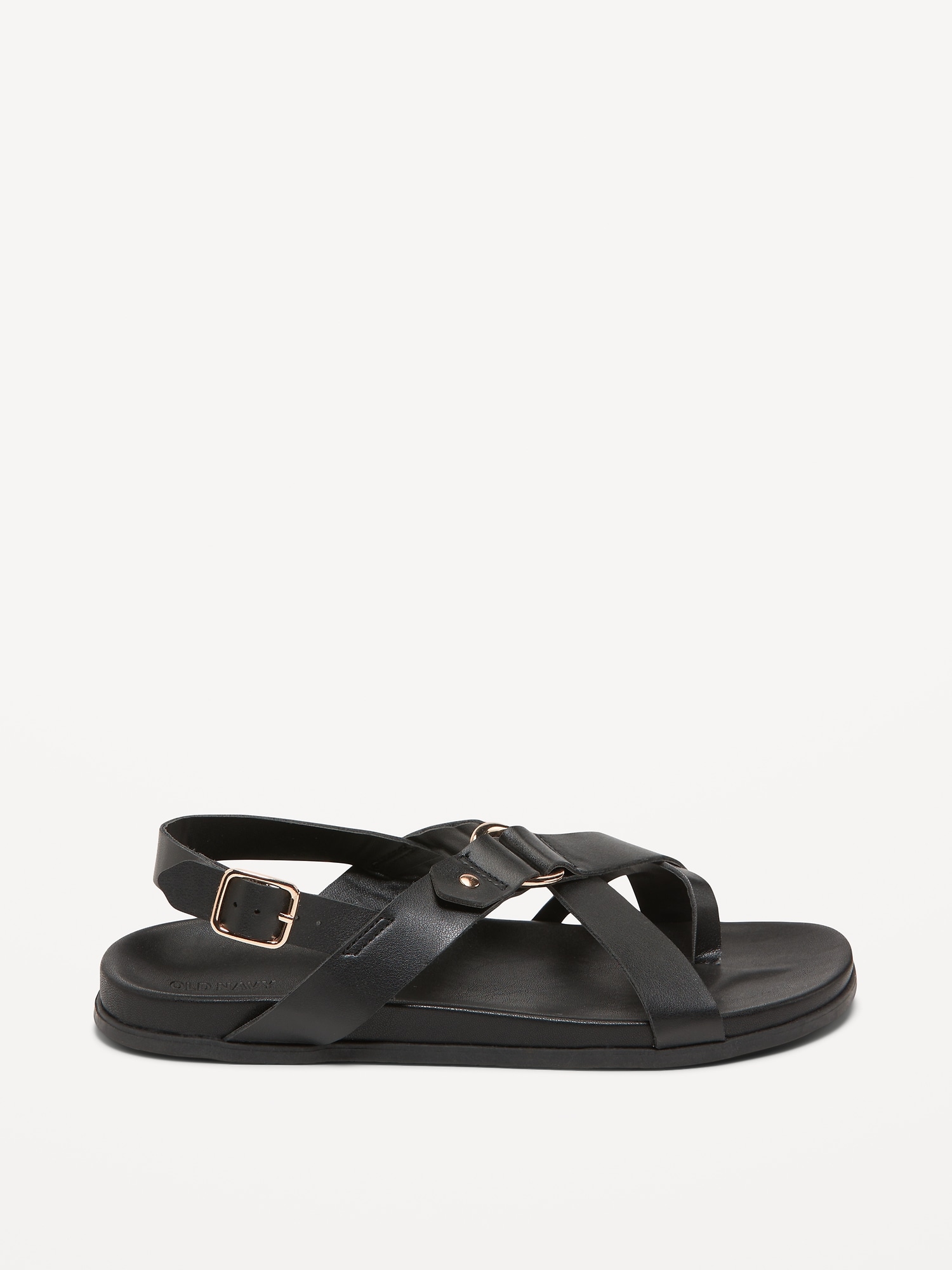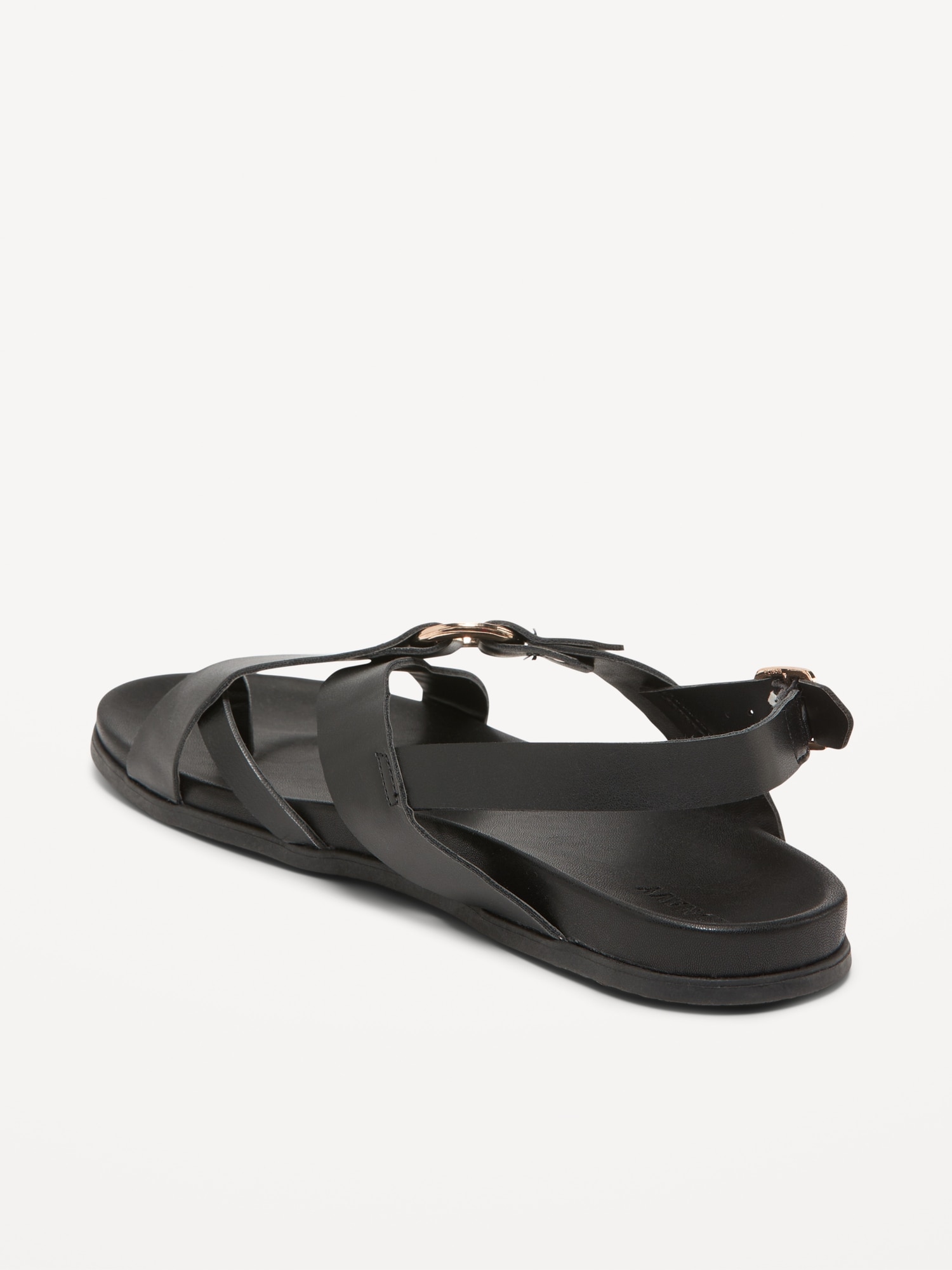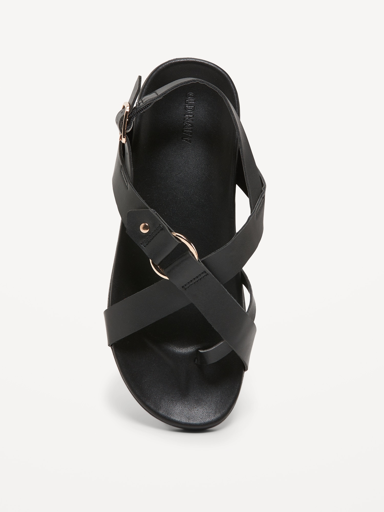 Strappy O-Ring Sandals: faux leather upper, buckle fastening, gold tone O-ring detail, molded foot bed, #663906