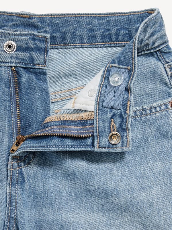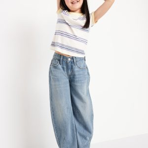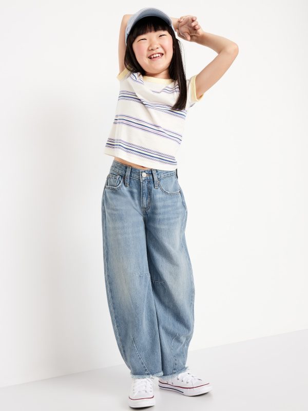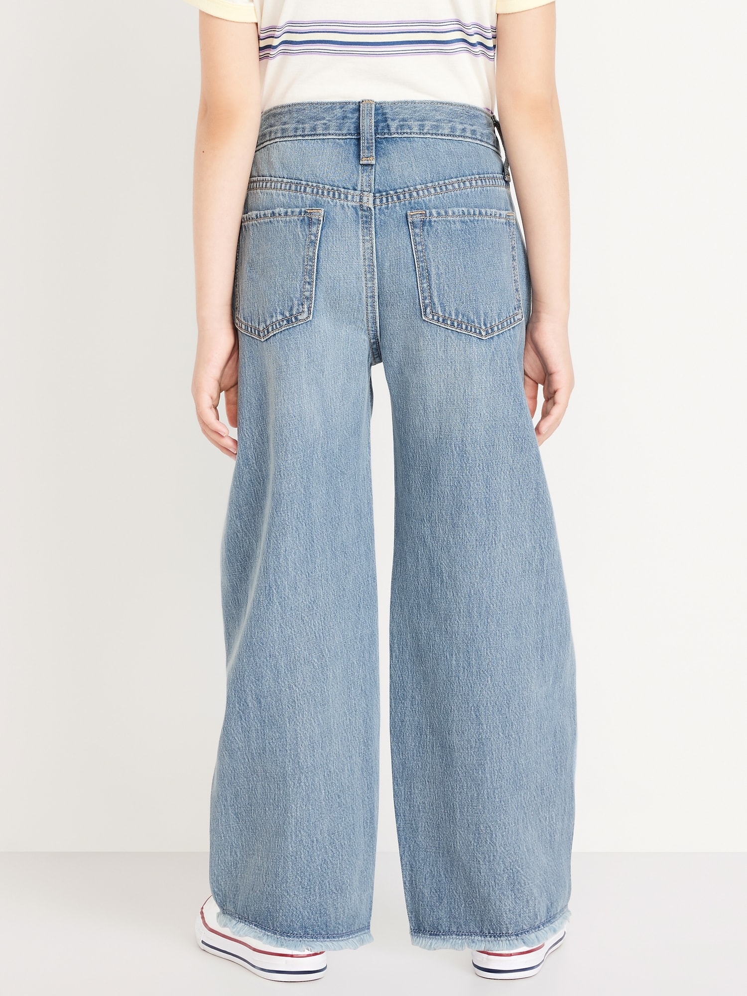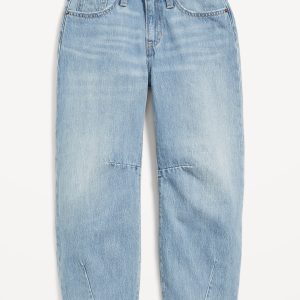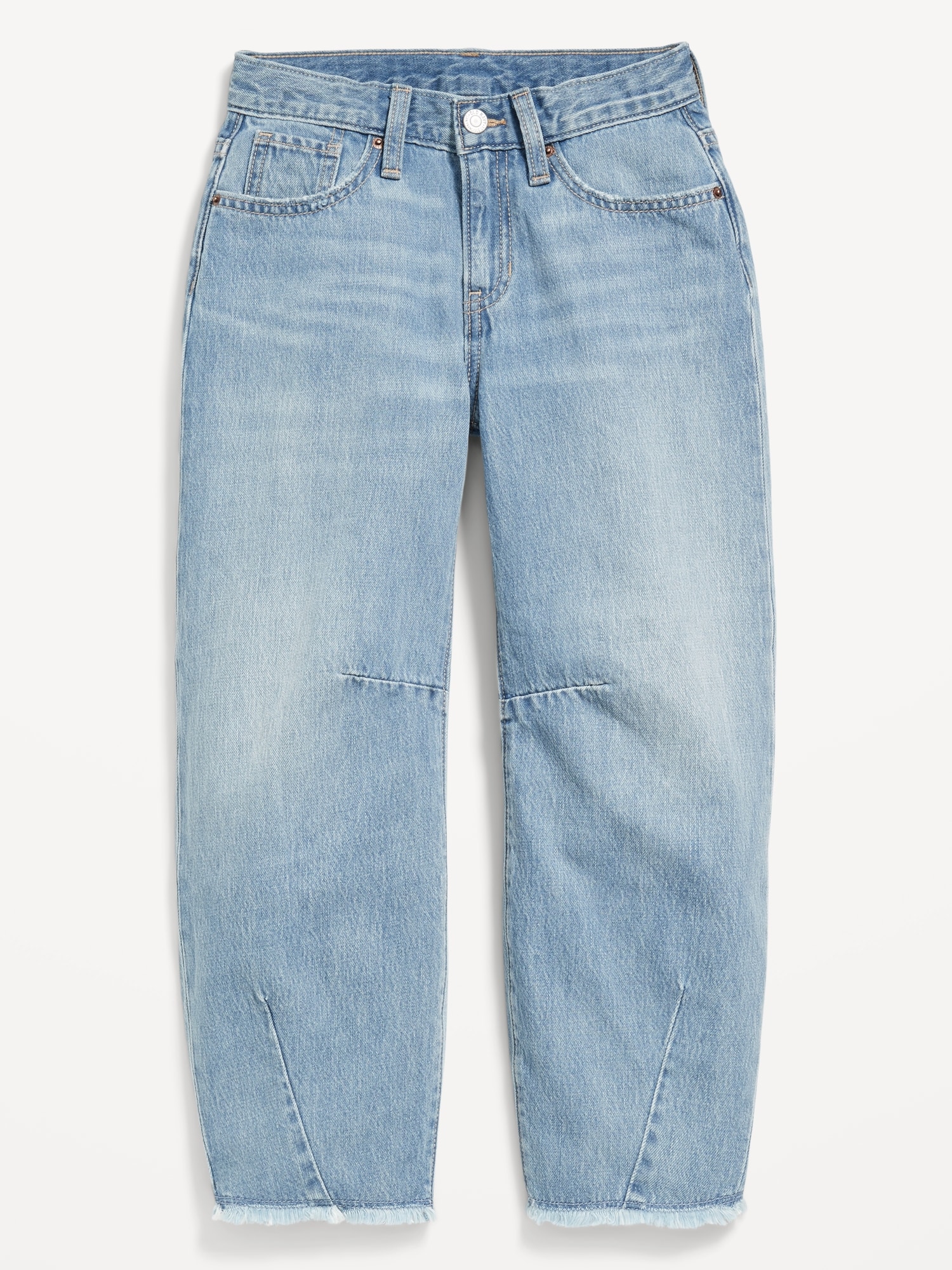 Super Baggy Barrel-Leg Jeans for Girls: mid rise, interior adjustable waistband, snap button closure (sizes 5-8), regular button closure (sizes 10-20), zip fly, scoop pockets and coin pocket, patch pockets at back, barrel leg, #803738
