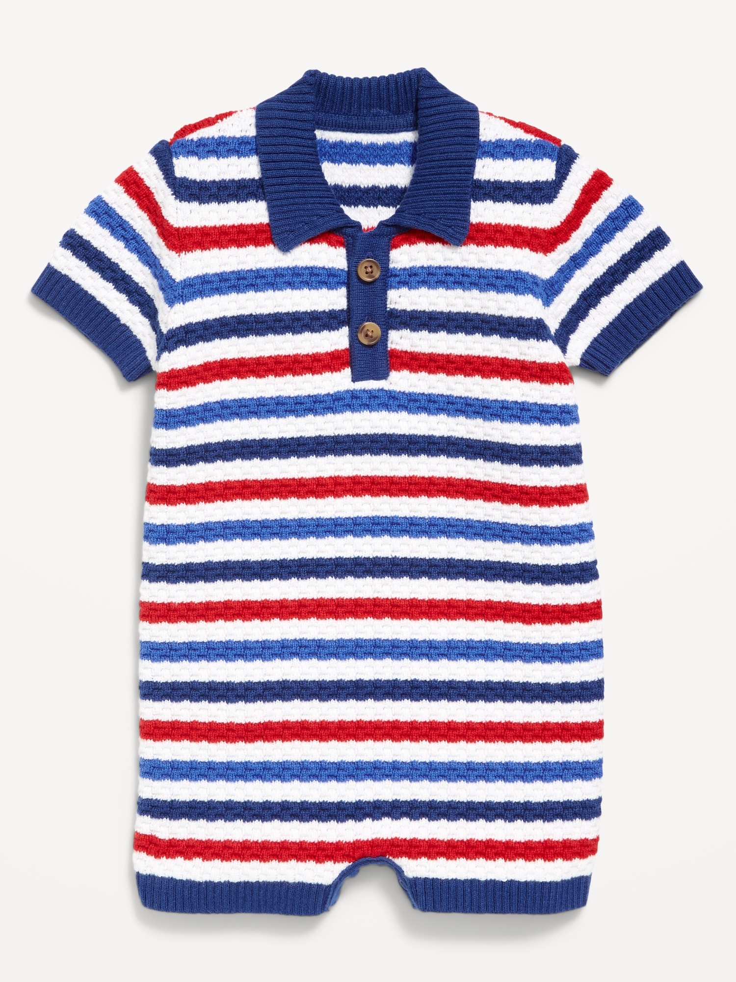 Sweater-Knit Polo One-Piece Romper for Baby: spread collar, two-button placket, short sleeves, hidden snaps along inseam, all-over stripes, #762091