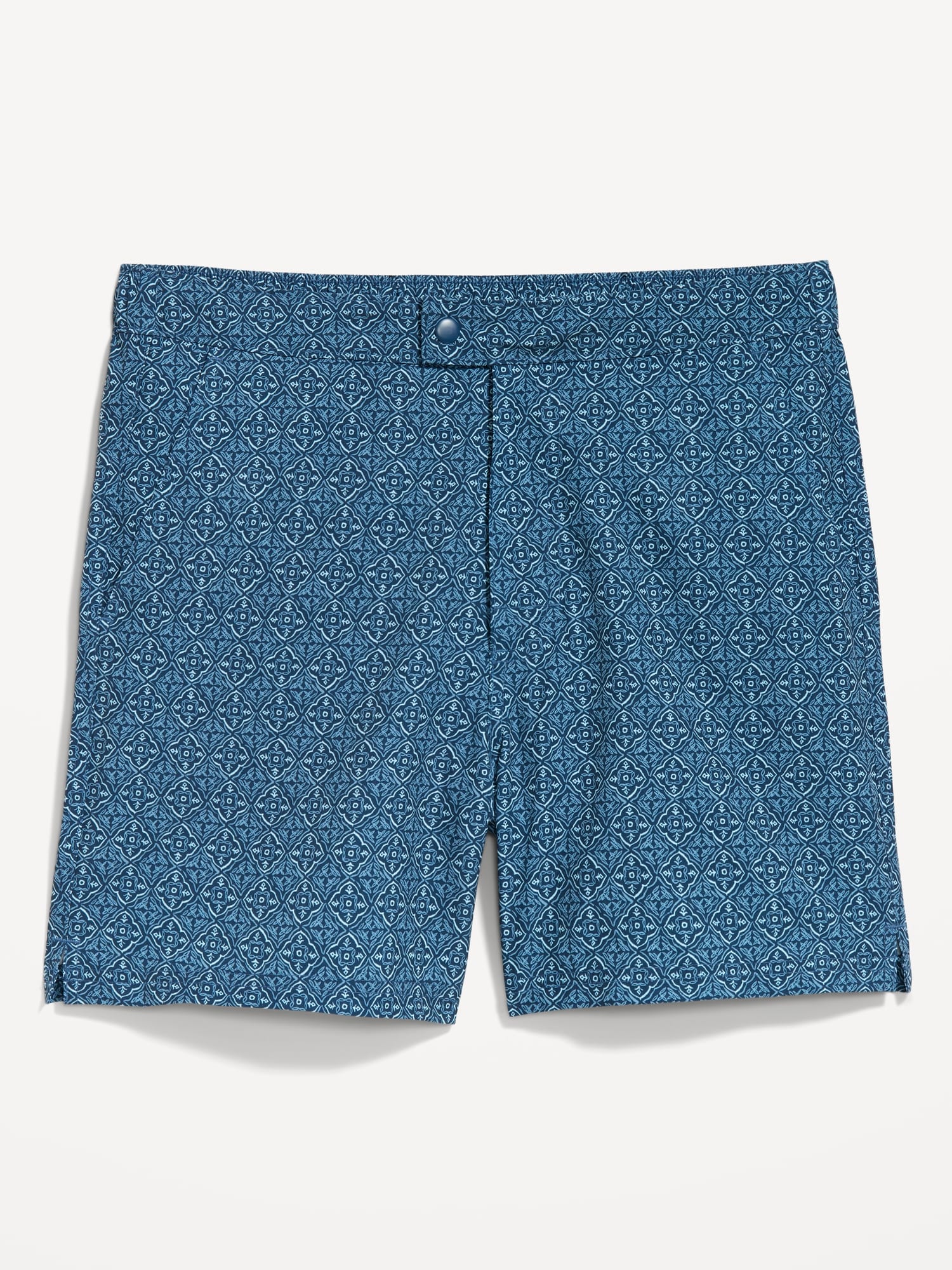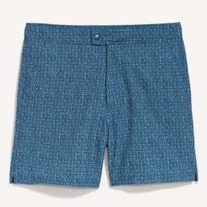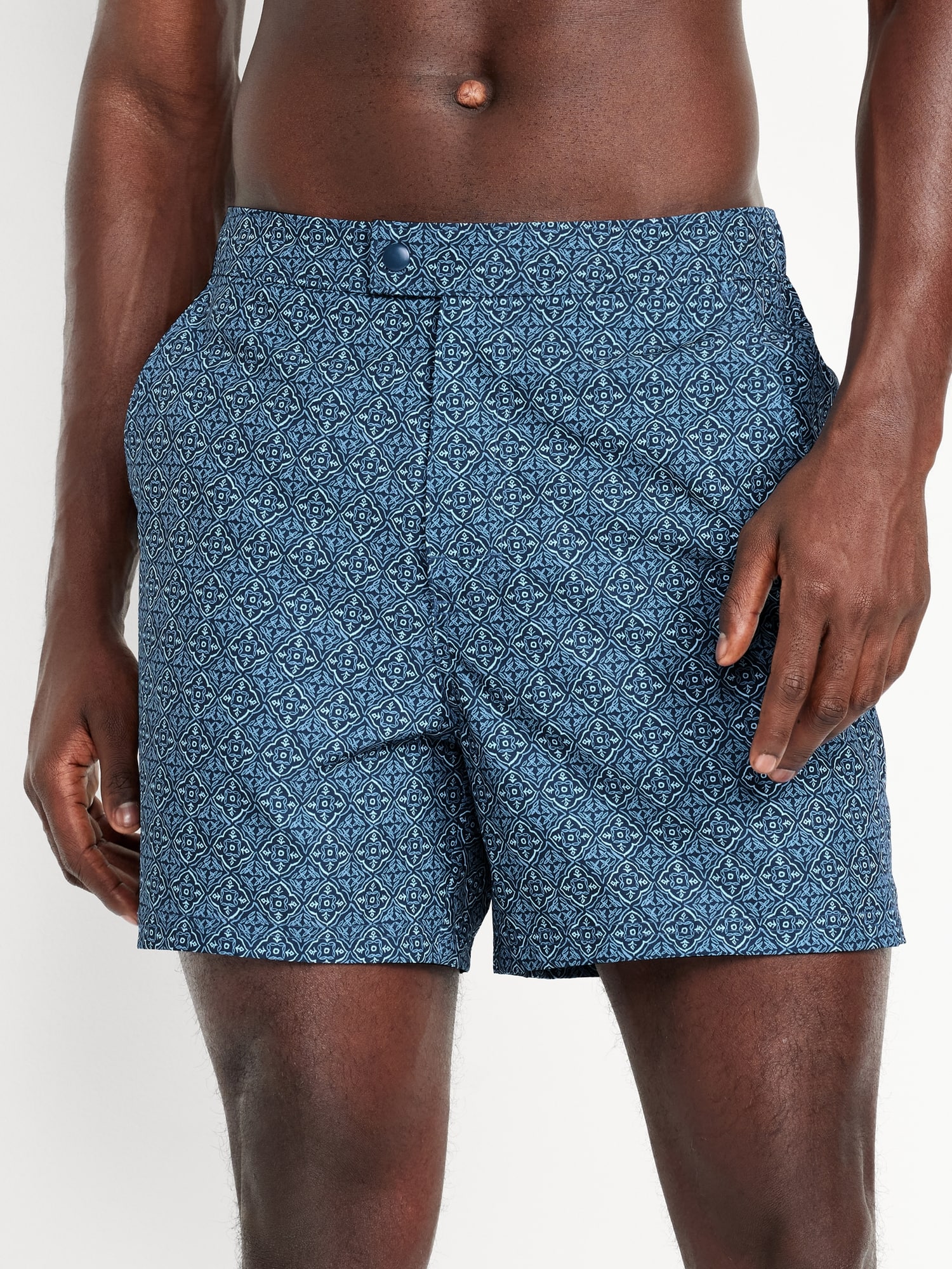 Tailored Swim Trunks — 5-inch inseam: snap front, interior drawstring with elastic back waist, diagonal front pockets, snap-flap back right pocket, quick dry, four-way stretch, #665104