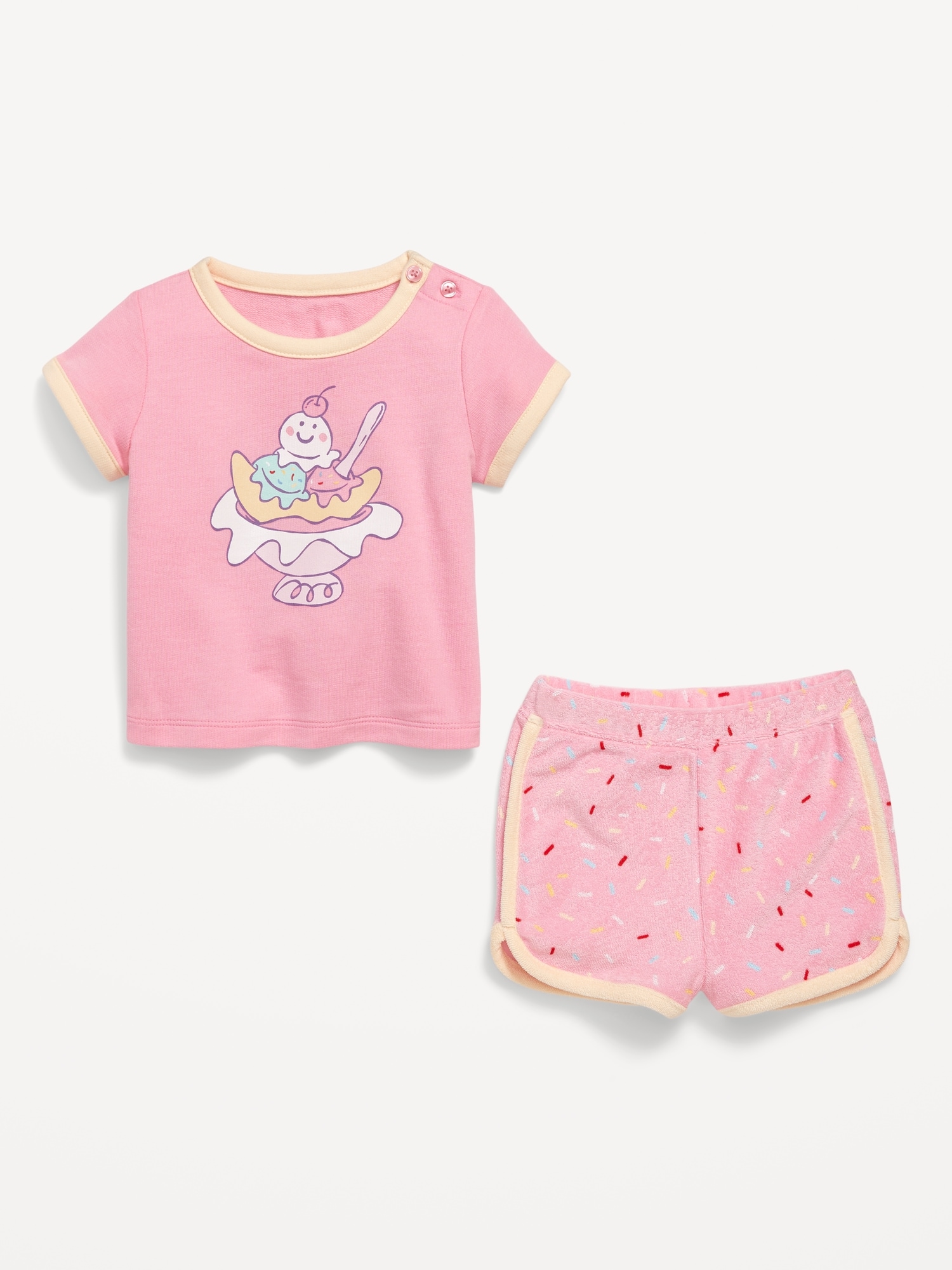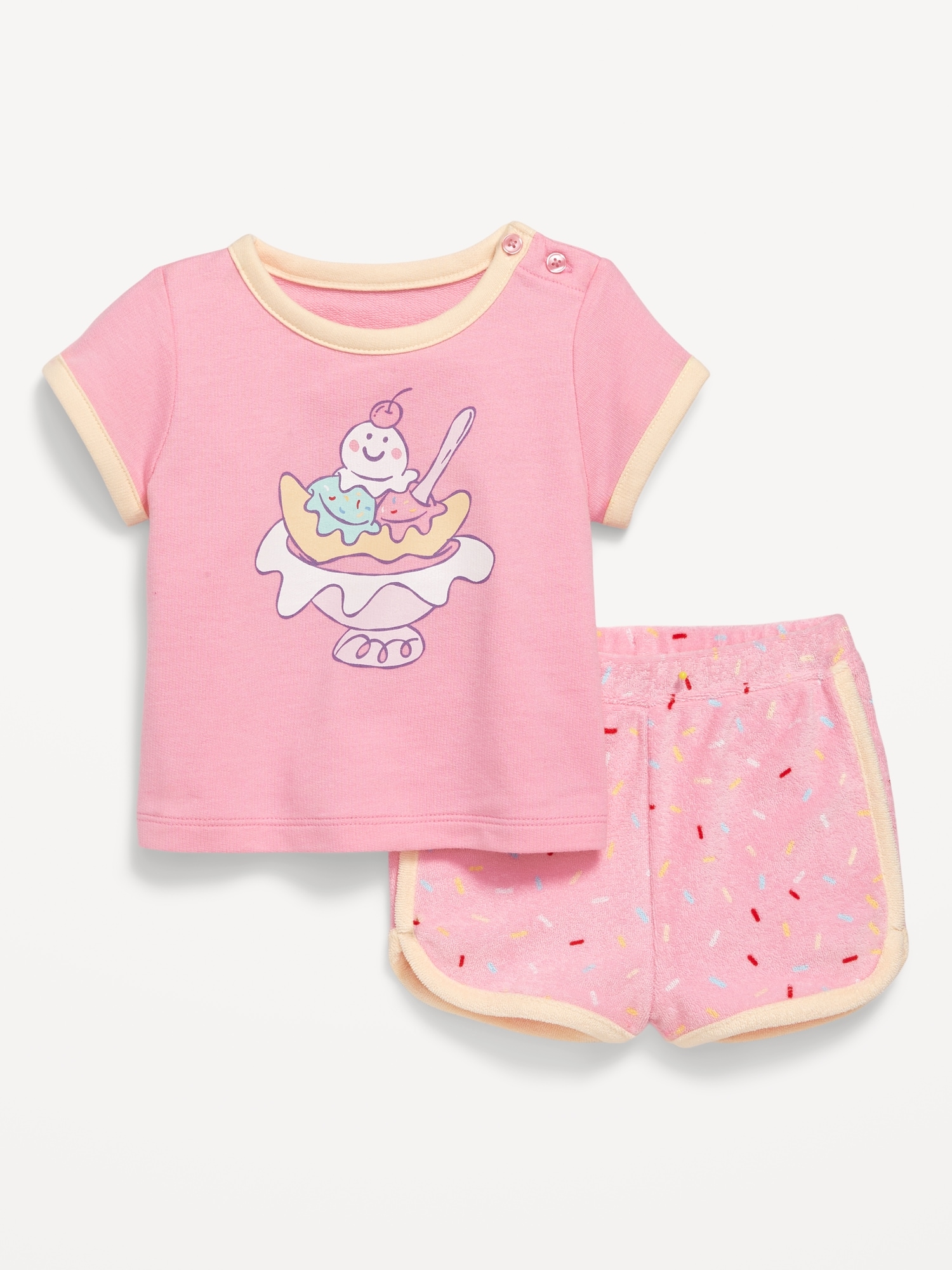 Terry Ringer Graphic T-Shirt and Shorts Set for Baby: crew neck with buttons at shoulder, dolman sleeves, front graphic, functional elastic-drawstring waist shorts, available exclusively online and at old navy outlets, #766737
