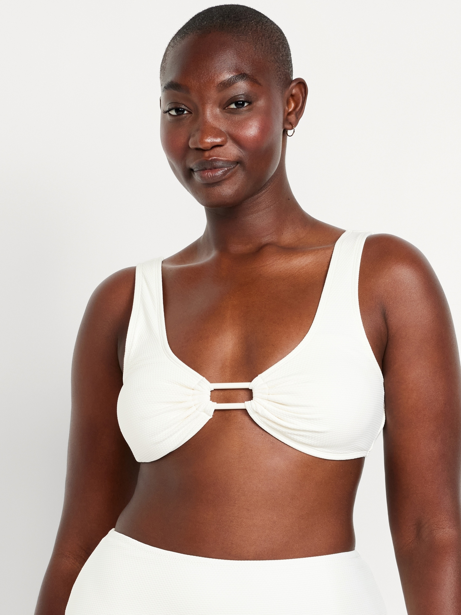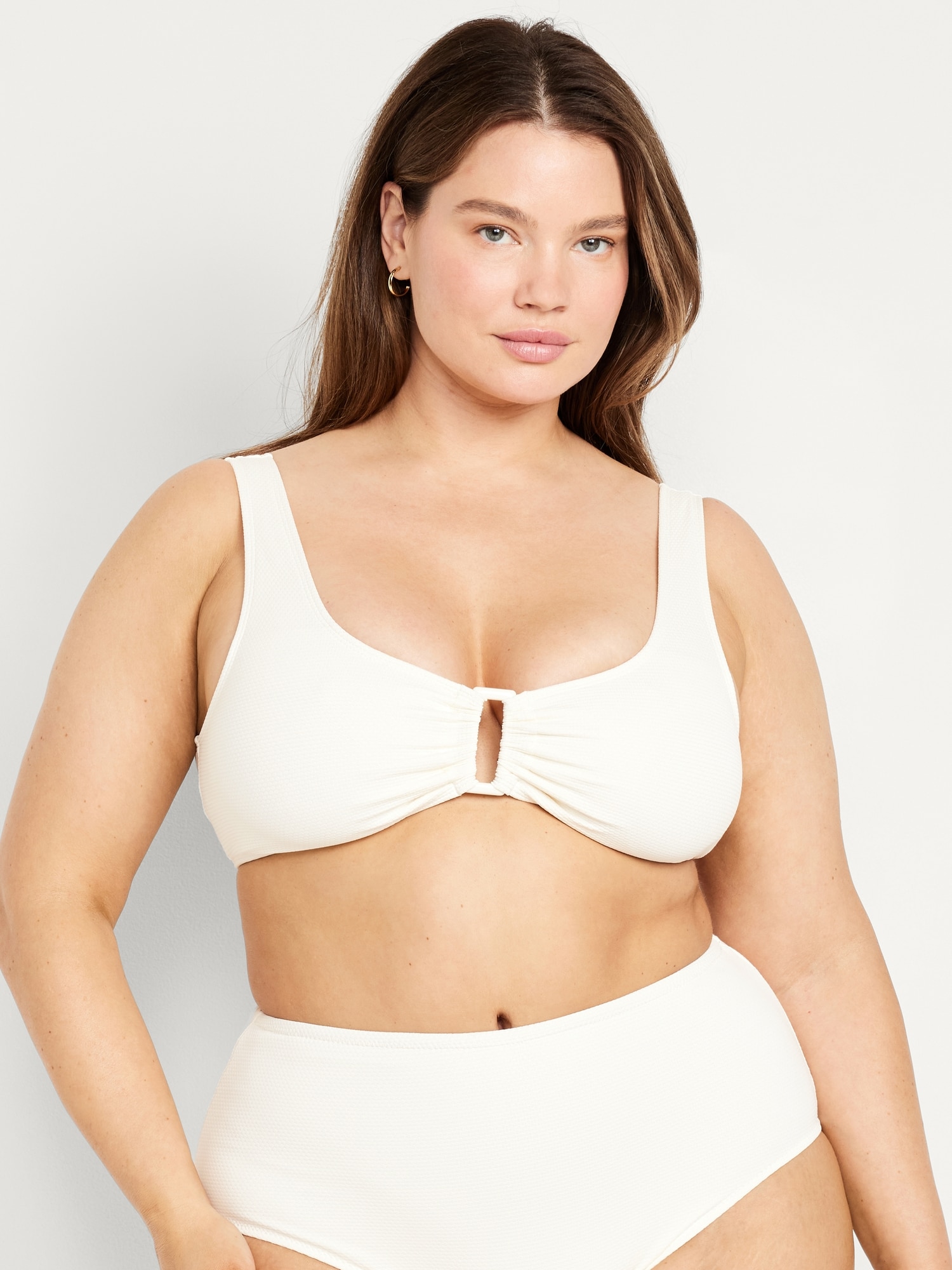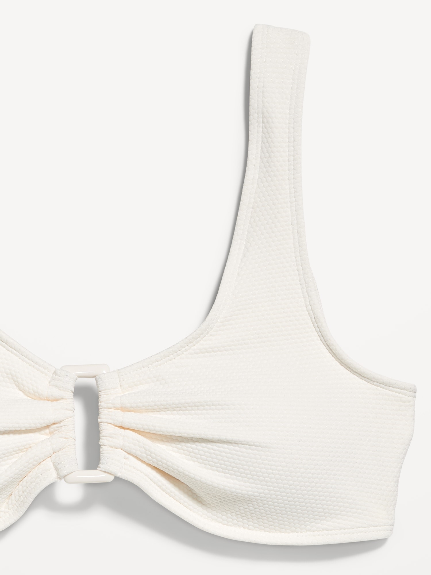 Textured Swim Top: scoop neck, wide straps, ruched front with o-ring accent, removable cups, hook-and-eye clasp at back, #660878