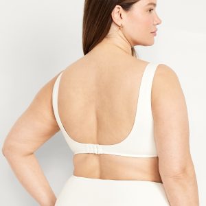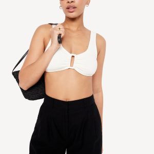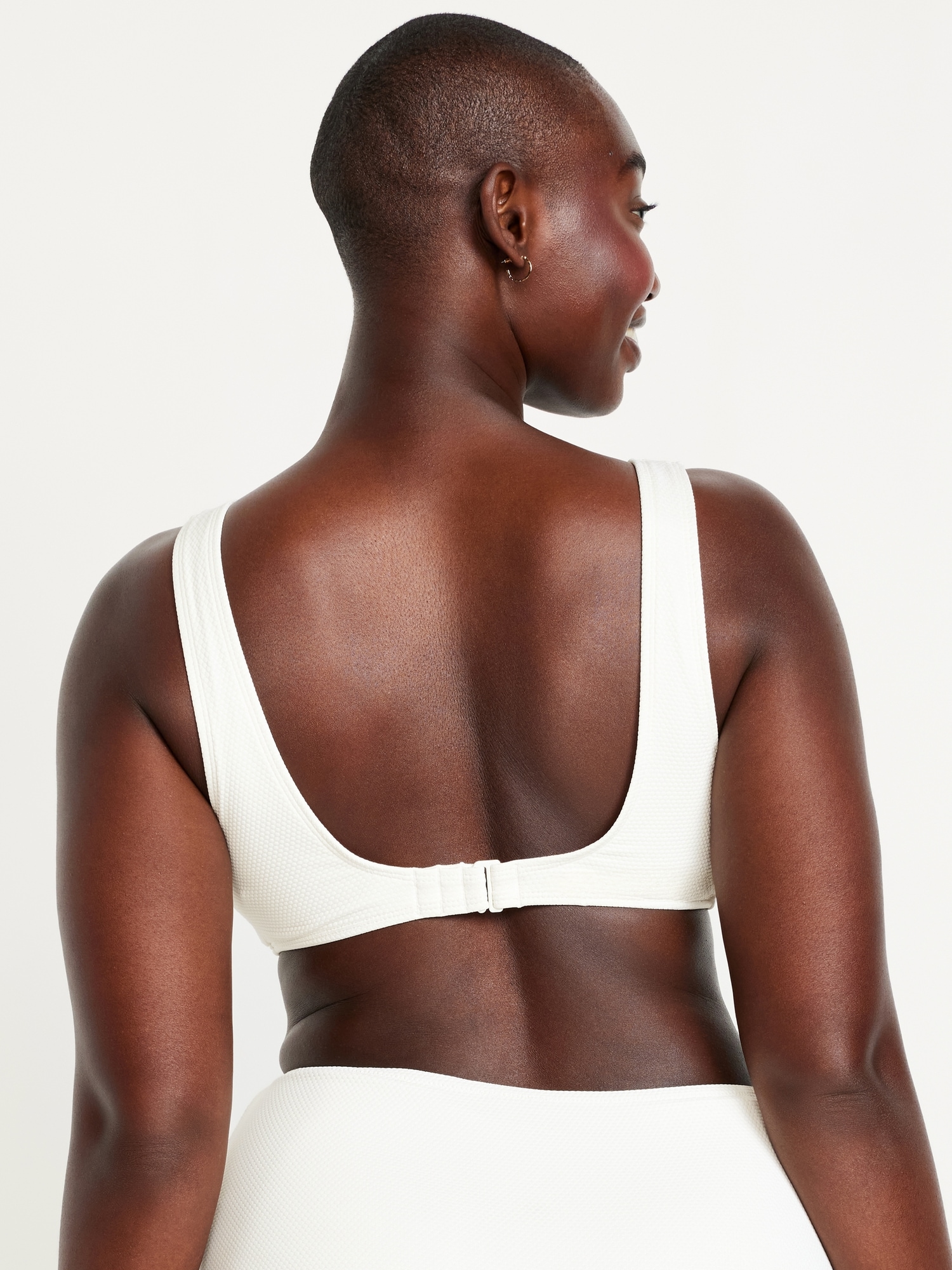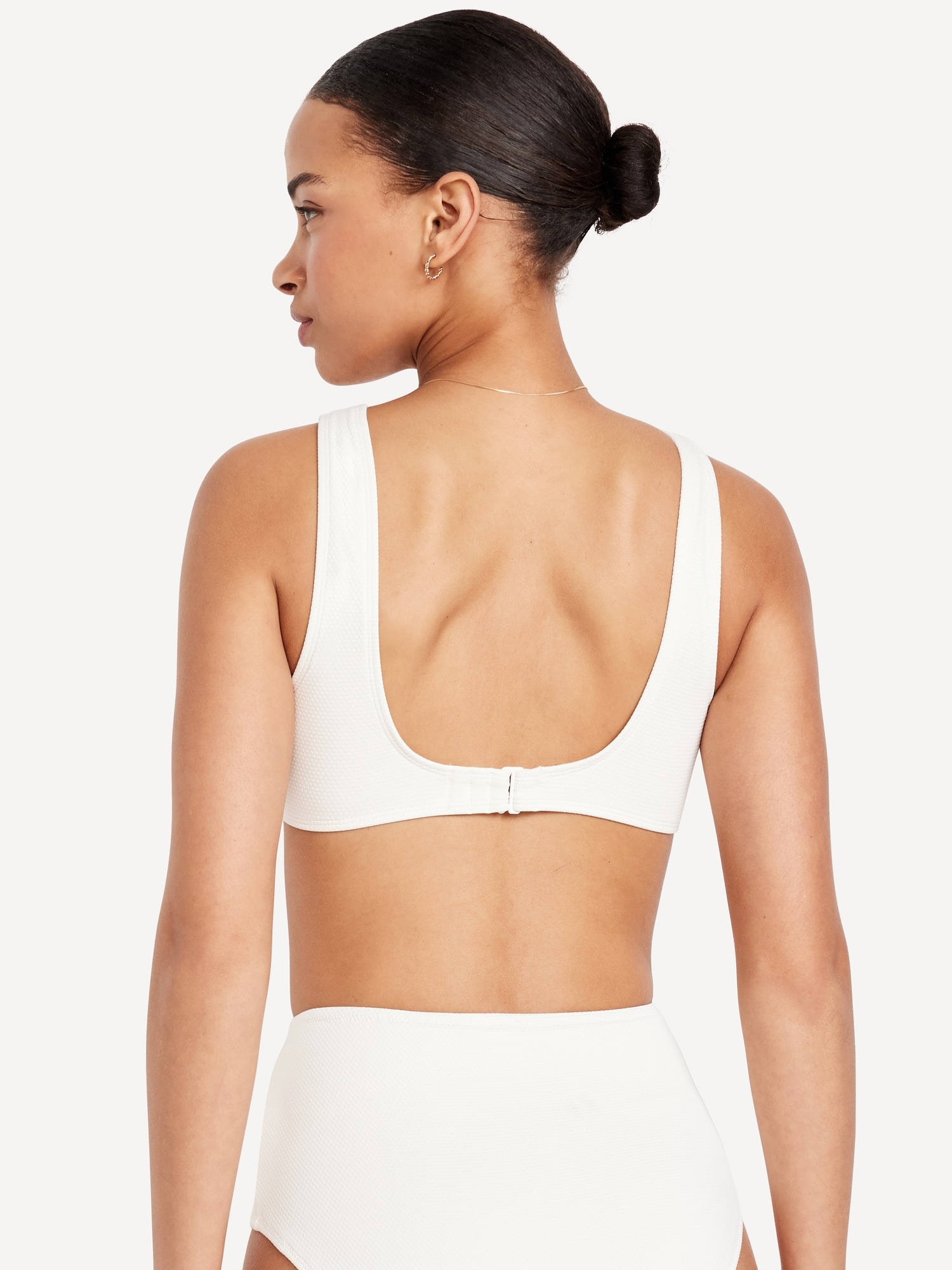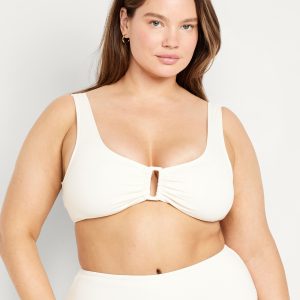 Textured Swim Top: scoop neck, wide straps, ruched front with o-ring accent, removable cups, hook-and-eye clasp at back, #660878