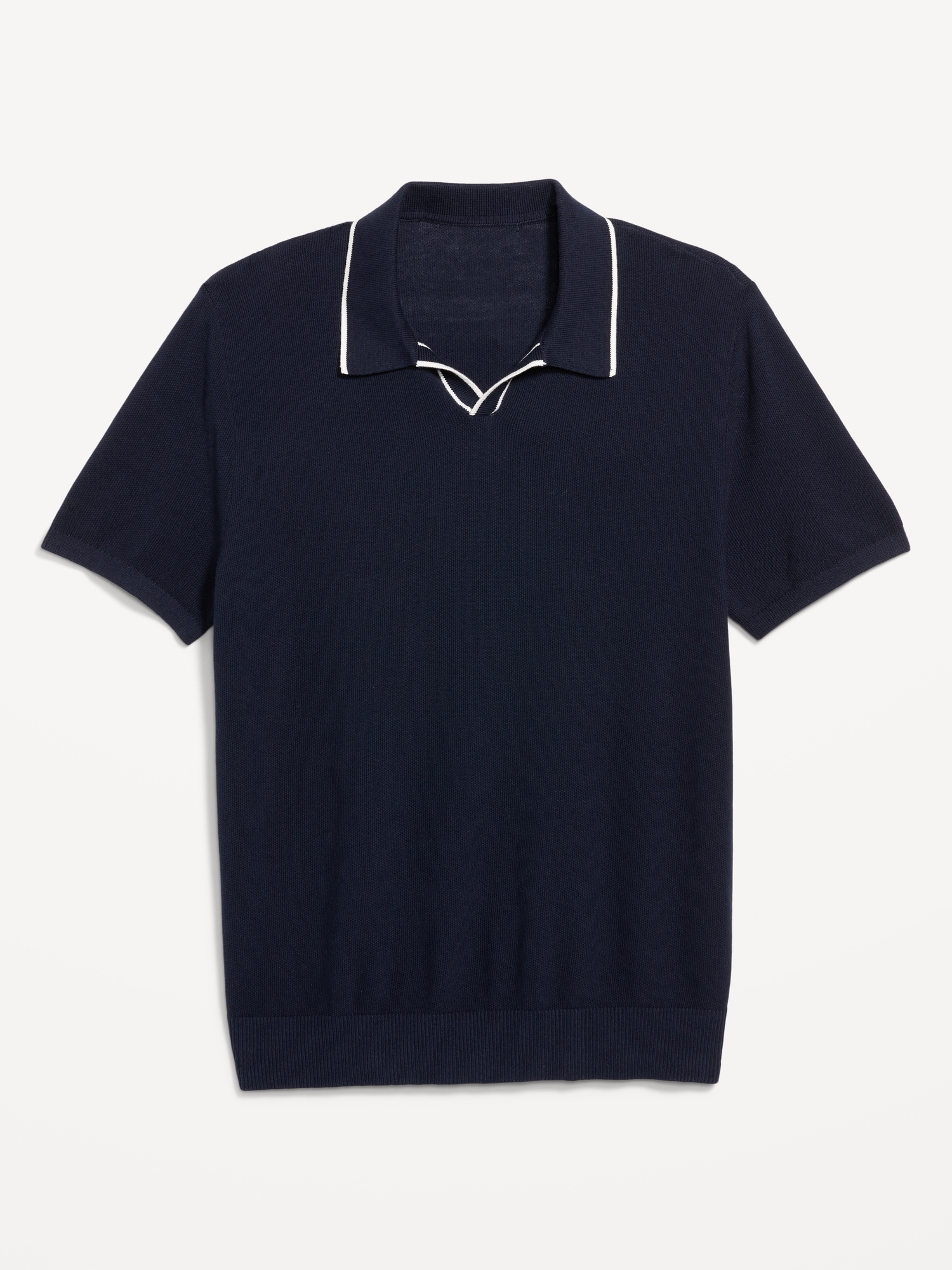 Tipped Collar Polo Sweater: spread collar, short sleeves, buttoned placket, pullover style, #802042