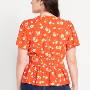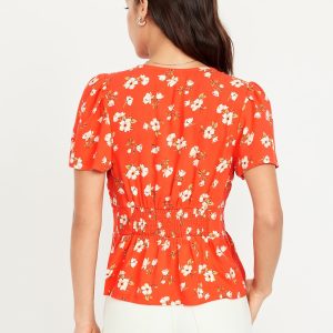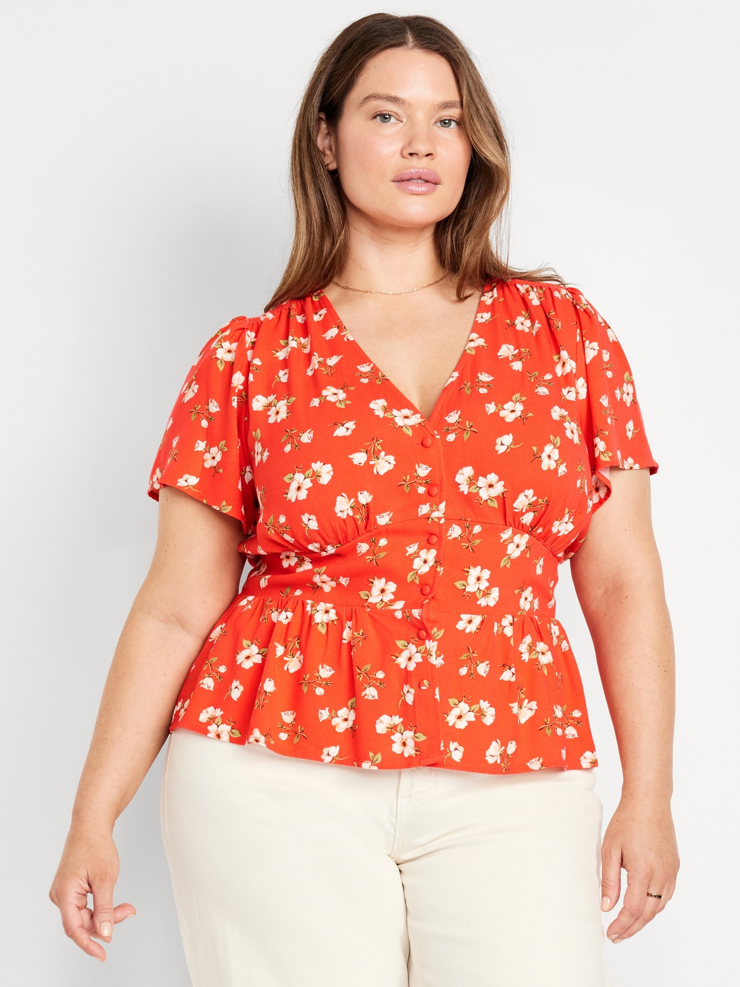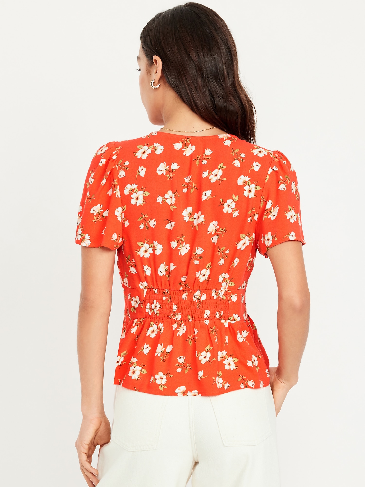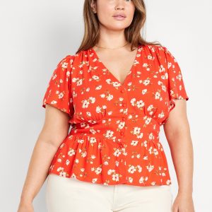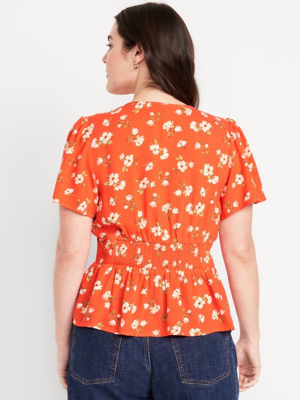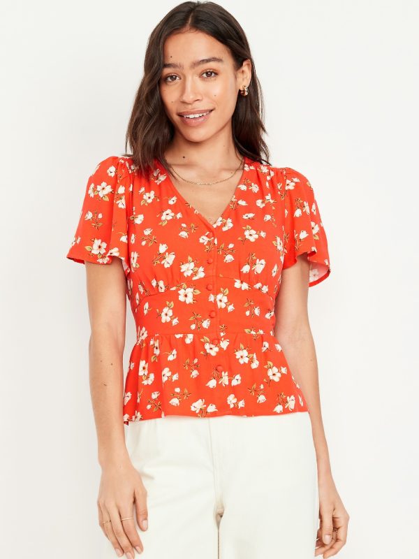 V-Neck Button-Down Crepe Top: v-neck, short flutter sleeves, button front, shirred shoulder seams, smocked back waist, #704153