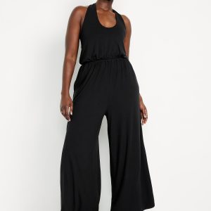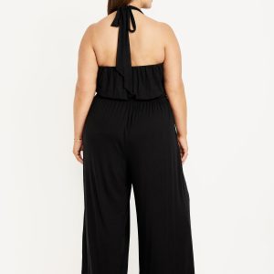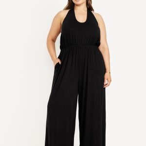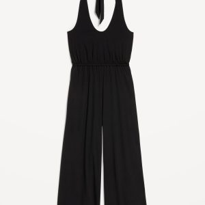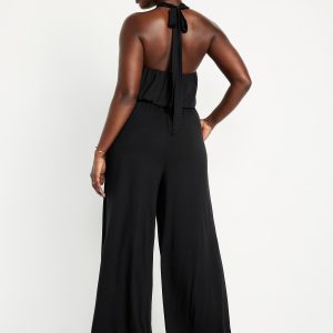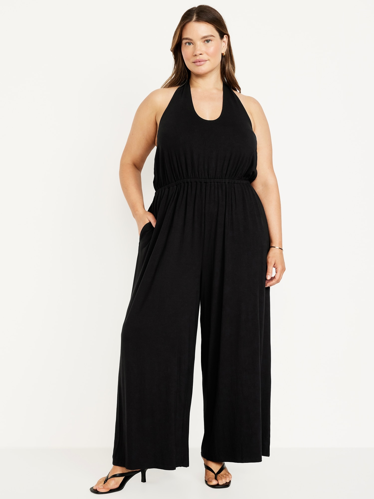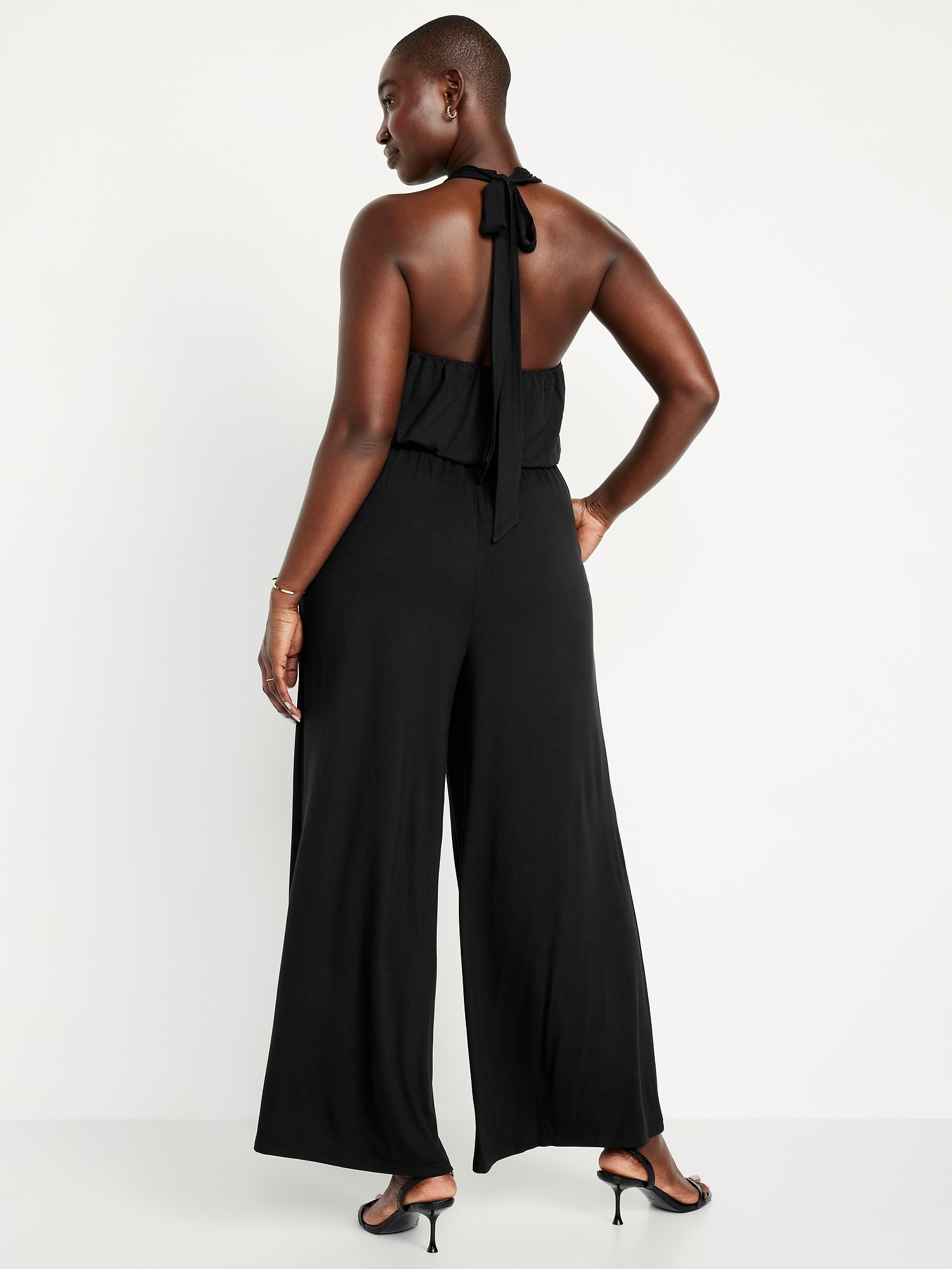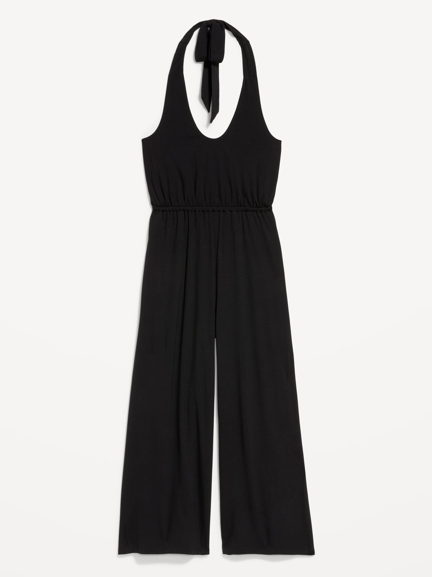 Waist-Defined Halter Jumpsuit: scoop neck, tie-back halter straps, shirred elastic waist, wide leg, #705487