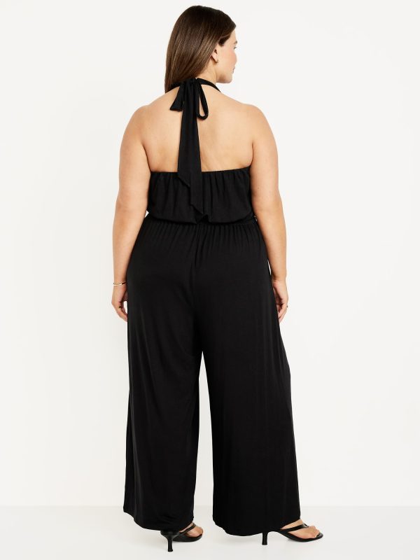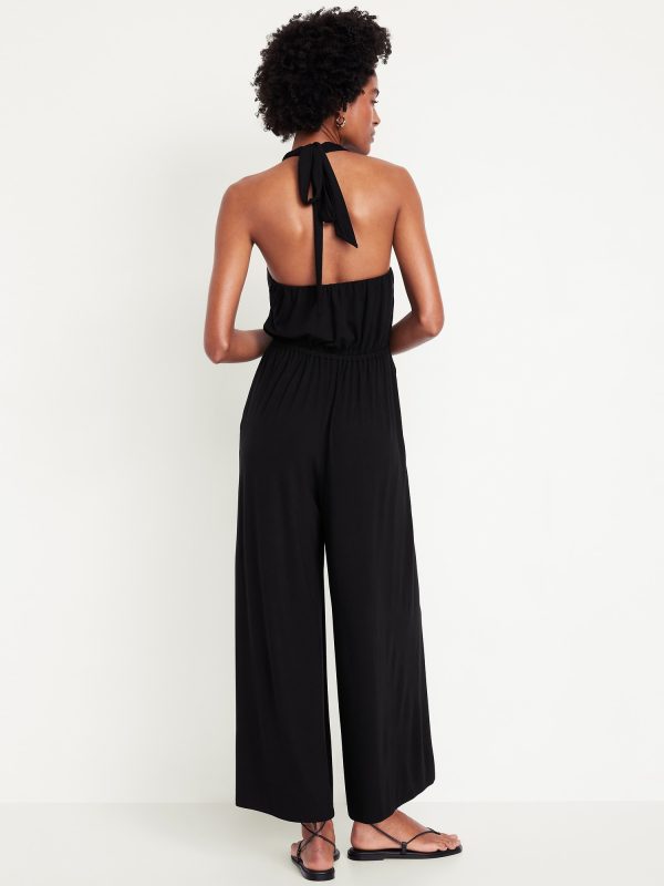 Waist-Defined Halter Jumpsuit: scoop neck, tie-back halter straps, shirred elastic waist, wide leg, #705487