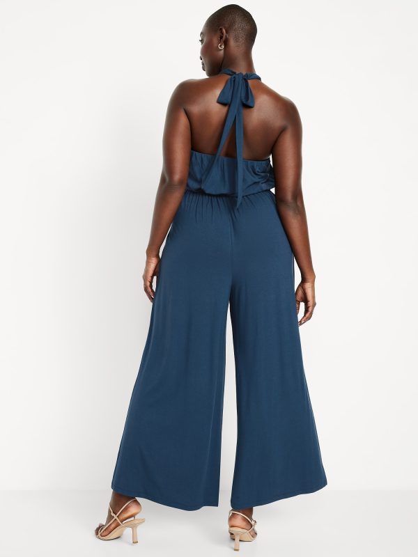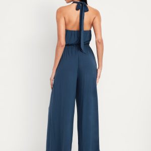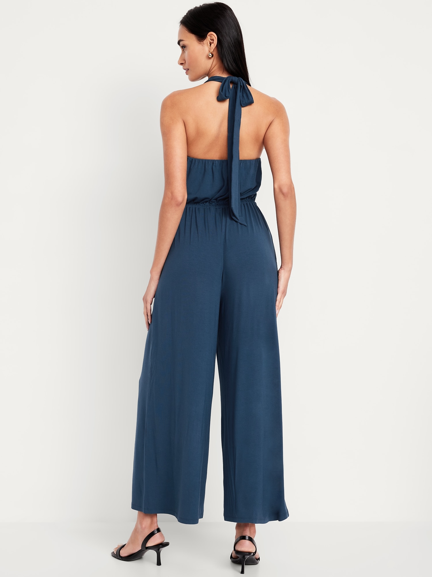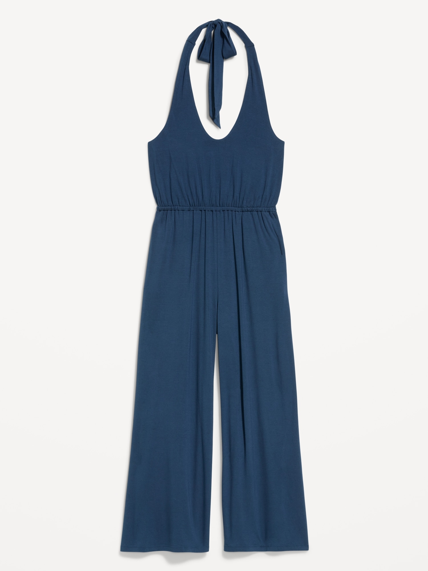 Waist-Defined Halter Jumpsuit: scoop neck, tie-back halter straps, shirred elastic waist, wide leg, #705487