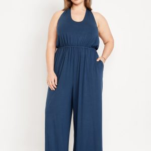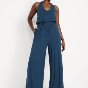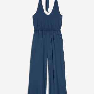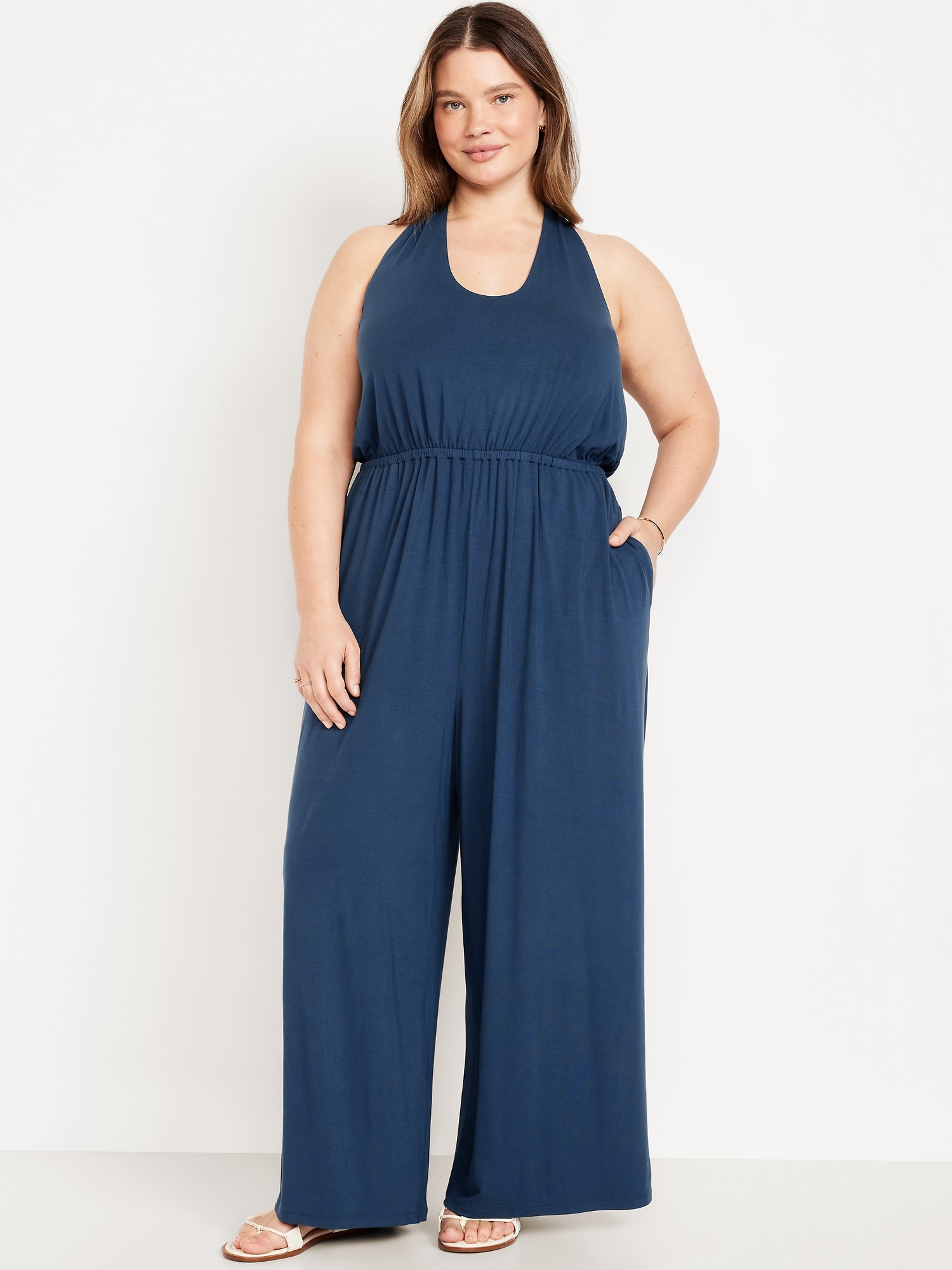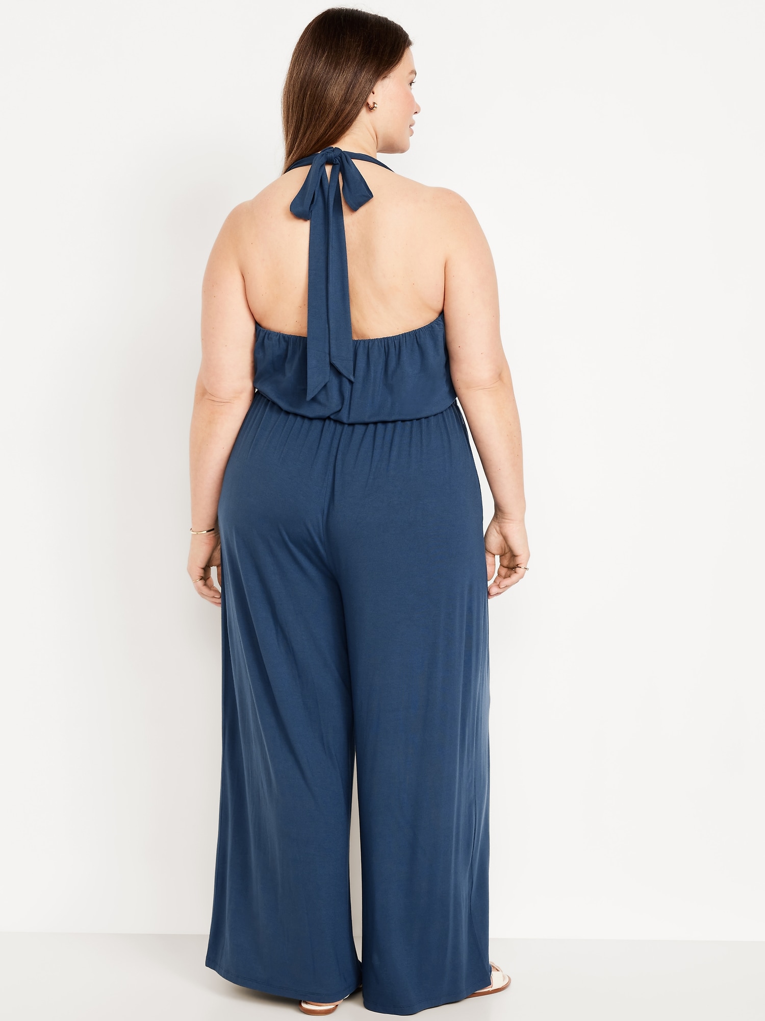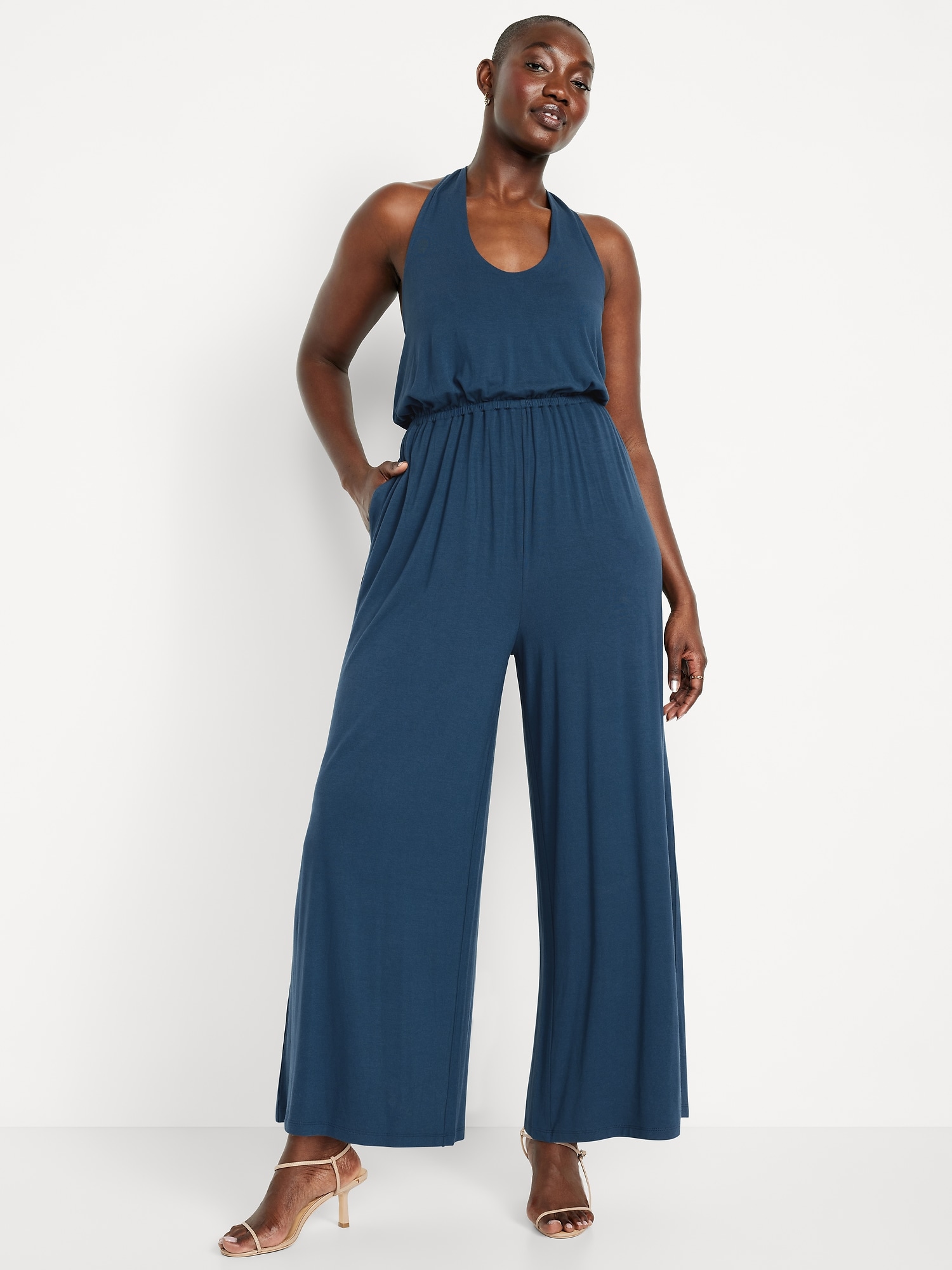 Waist-Defined Halter Jumpsuit: scoop neck, tie-back halter straps, shirred elastic waist, wide leg, #705487