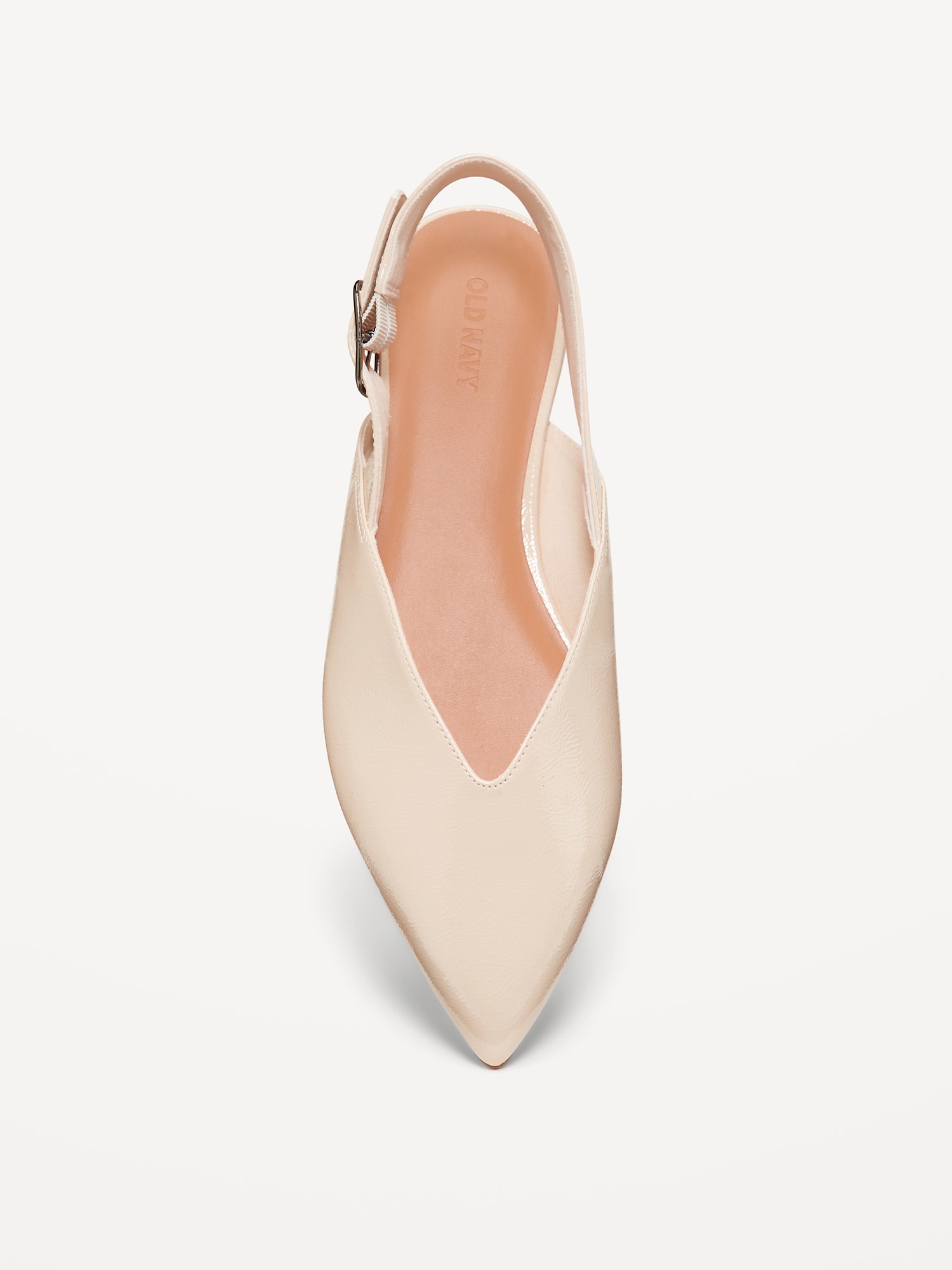 Wide Strap Slingback Flats: pointed toe, V-cut, buckle fastening at ankle, open heel, firm foot bed, textured outsole, #750760