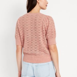 Wool-Blend Puff-Sleeve Tie-Neck Sweater: tie-front neck with keyhole cutout, elbow-length puff sleeves, pullover style, #785108