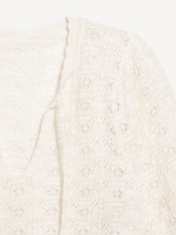 Wool-Blend Puff-Sleeve Tie-Neck Sweater: tie-front neck with keyhole cutout, elbow-length puff sleeves, pullover style, #785108