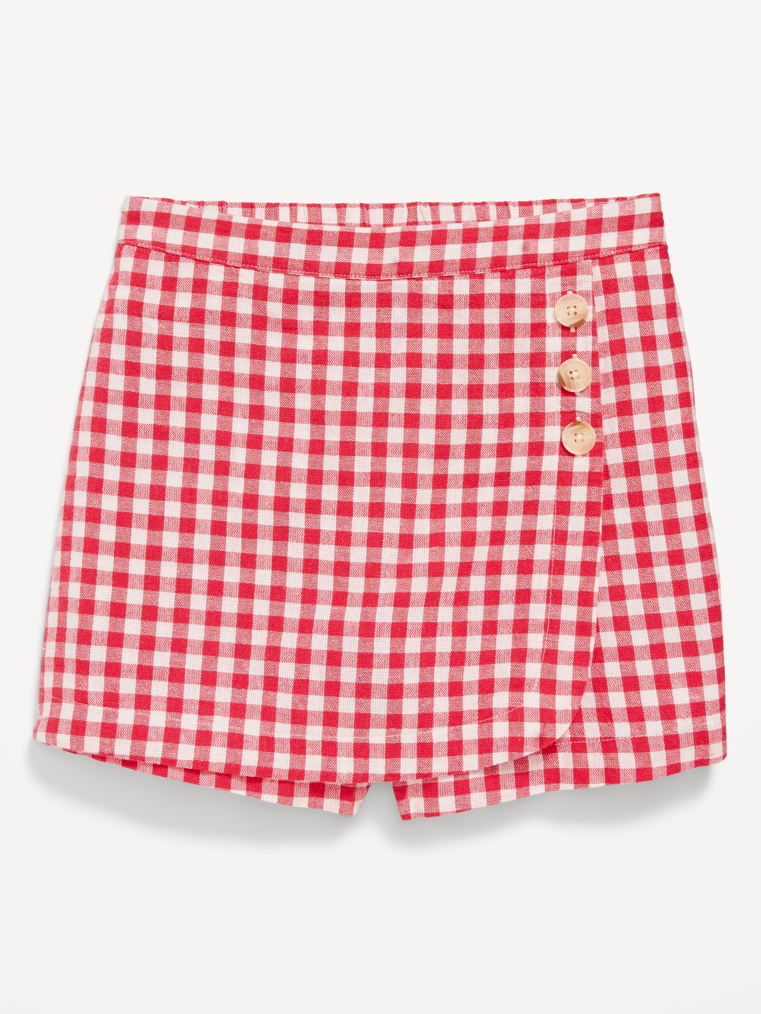 Wrap-Front Linen-Blend Skort for Girls: built-in shorts, elasticized back waist, decorative three-button front, easy pull-on style, #766700